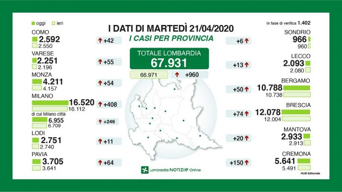 Secondo i dati diffusi oggi (21 aprile) da Regione Lombardia sono in lieve aumento i casi positivi da Covid 19 al contrario, fortunatamente, sono in calo i pazienti ricoverati nelle terapie intensive. Dalla Regione, poi, sono in arrivo 16,5 mln di euro per le famiglie lombarde che hanno dovuto fronteggiare delle difficoltà economiche a causa del Coronavirus. Si tratta di due diversi tipi di contributi di 500 euro, uno per tassa sulla prima casa e l’atro per l’acquisto di strumenti tecnologici. Aiuti riservati a redditi Isee uguali o inferiore ai 30mila euro. Le domande potranno essere fatte dal 4 all’11 maggio.