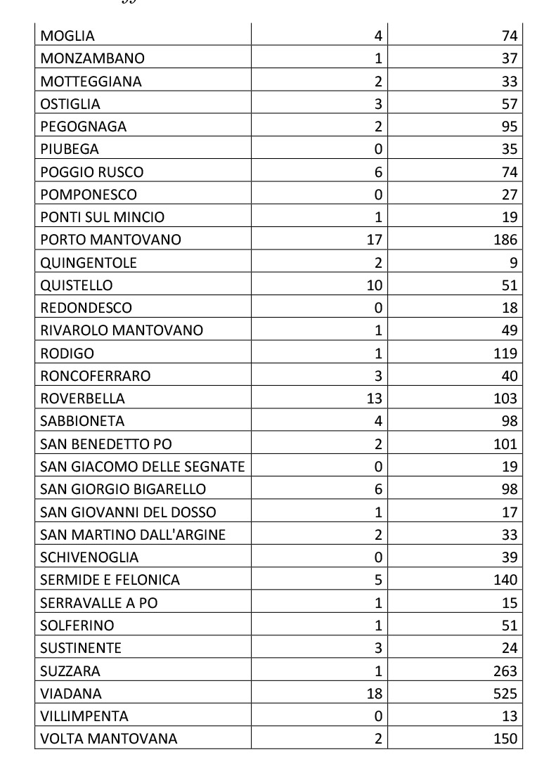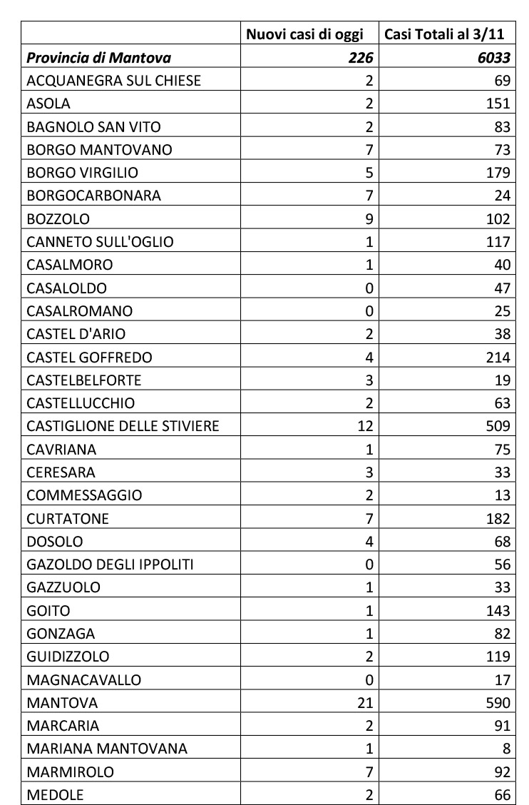 CoronavirusCoronavirus topCronacaTop-Home Nuovi contagi: +226 3 Novembre 2020 Share FacebookTwitterPinterestWhatsAppEmailTelegram MANTOVA Secondo il bollettino di Ats e Prefettura sono 226 i nuovi casi in provincia di Mantova. Il maggior numero di positivi è registrato a Mantova (21), Viadana (18) e Porto Mantovano (17)