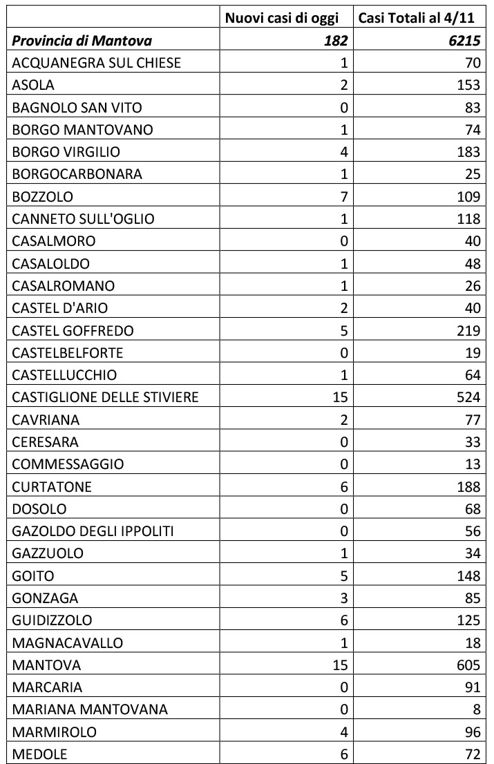MANTOVA Sono 182 i nuovi casi in provincia di Mantova secondo il bollettino giornaliero di prefettura  e Ats.  Diciotto positivi sono concentrati a Suzzara, 15 a Mantova  e Castiglione delle Stiviere.