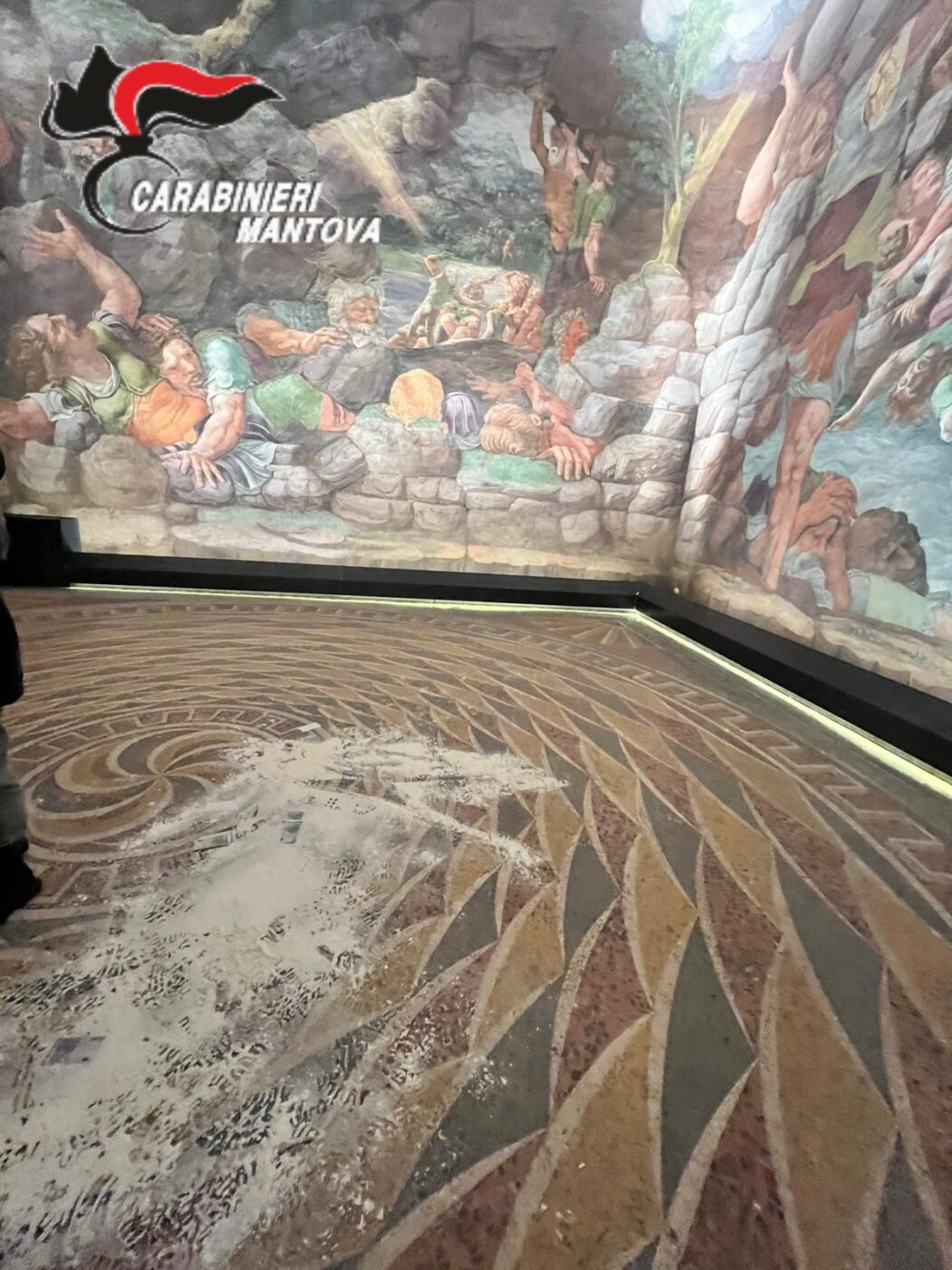 Domenica 4 gennaio. È scoccato da poco mezzogiorno quando giunge una chiamata al 112 da parte della vigilanza di Palazzo Te di Mantova. Nella richiesta di intervento viene segnalata la presenza di tre soggetti, attivisti ambientalisti, che hanno cosparso di farina la “sala dei giganti”, gettando a terra delle fotocopie di banconote da 20 euro e srotolando degli striscioni.