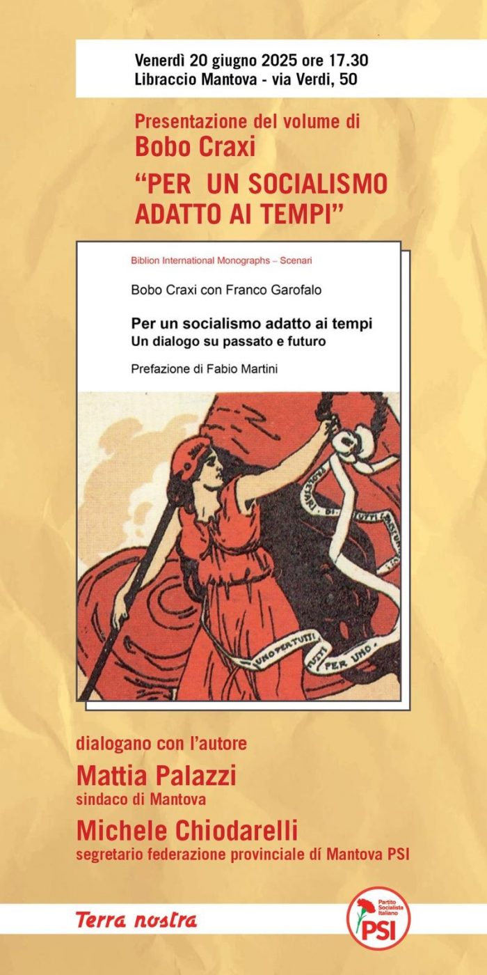 MANTOVA Bobo Craxi sarà a Mantova venerdì alle 17.30 al Libraccio, in via Verdi 50, per presentare il suo libro “Per un socialismo adatto ai tempi. Un dialogo su passato e futuro” scritto con Franco Garofalo. A dialogare con l’esponente socialista saranno il sindaco di Mantova Mattia Palazzi e il segretario provinciale del Psi Michele Chiodarelli. “Le riflessioni proposte da Bobo Craxi e Franco Garofalo – scrive nella prefazione Fabio Martini – hanno il dono della tempestività, contribuendo anche a evidenziare il vuoto concettuale e politico che in questa fase storica accompagna la sinistra socialista. Craxi e Garofalo non rivendicano alcuna ‘pretesa di scientificità’ e propongono una ricognizione critica su passato e presente, indicando alcuni sentieri che potrebbero portare verso territori nuovi, di nuovo fecondi”.