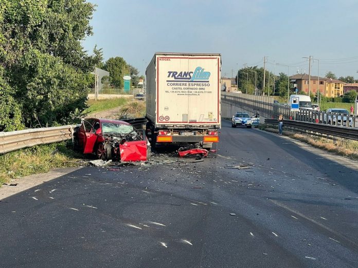 MANTOVA – Gravissimo incidente stradale ieri mattina all’alba, alle porte di Montichiari. Erano da poco passate le 5 quando, lungo il tratto bresciano della Goitese – la Sp 236 – un auto che procedeva in direzione di Mantova e condotta da un 23enne residente a Casaloldo è finita per schiantarsi frontalmente contro un camion. Un impatto violentissimo in cui ad avere la peggio è stato il giovane conducente della vettura, una Volkswagen Golf andata letteralmente distrutta nella parte anteriore.