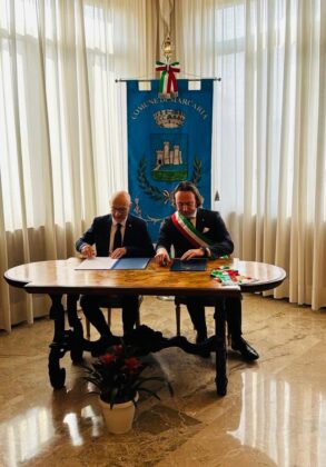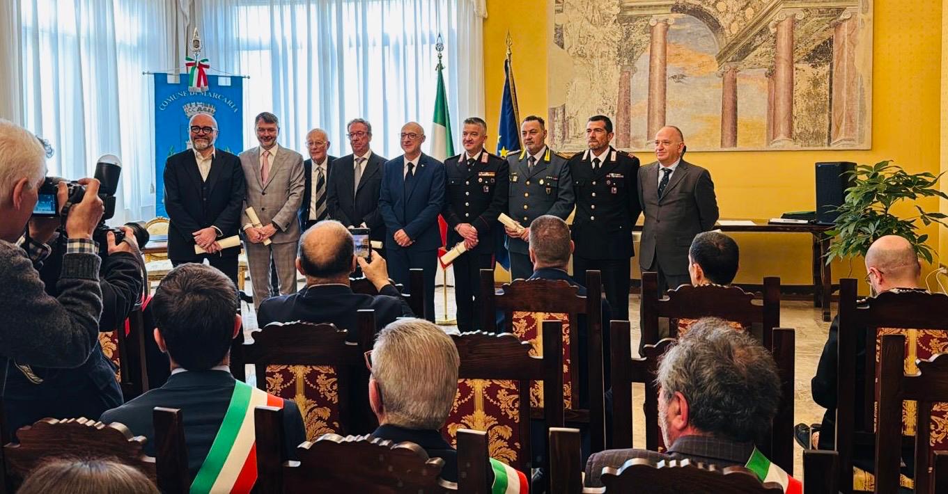 Terminata la cerimonia di consegna dei diplomi delle onorificenze, il Prefetto ha consegnato, nelle mani del Sindaco del Comune di Marcaria Carlo Alberto Malatesta, lo stemma ed il gonfalone ufficiale del Comune, concesso dal Presidente della Repubblica con proprio decreto.