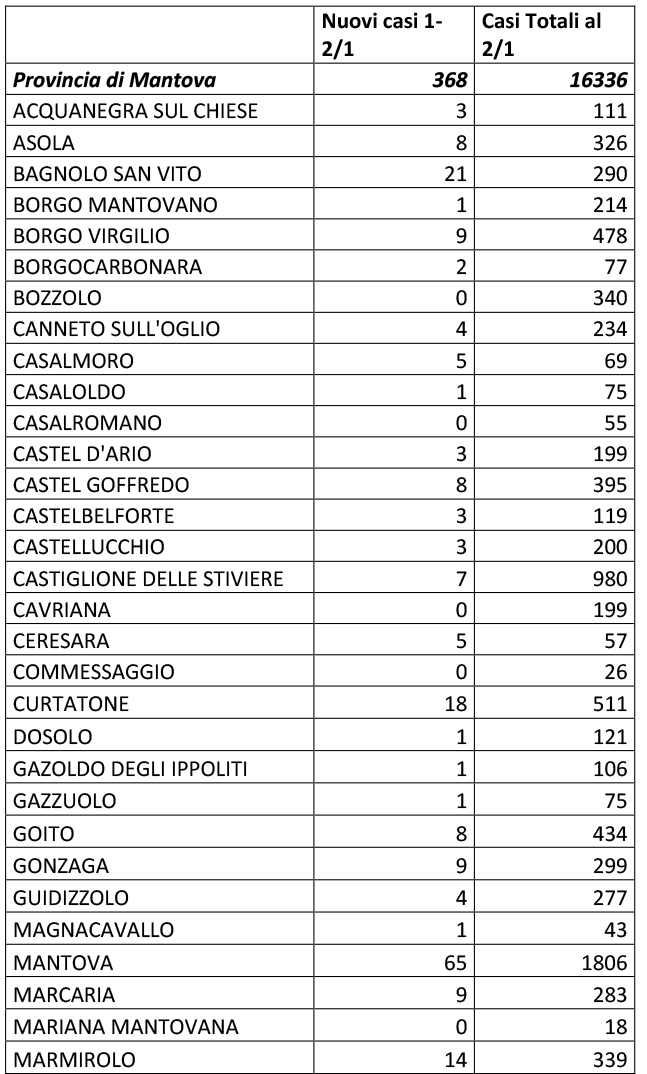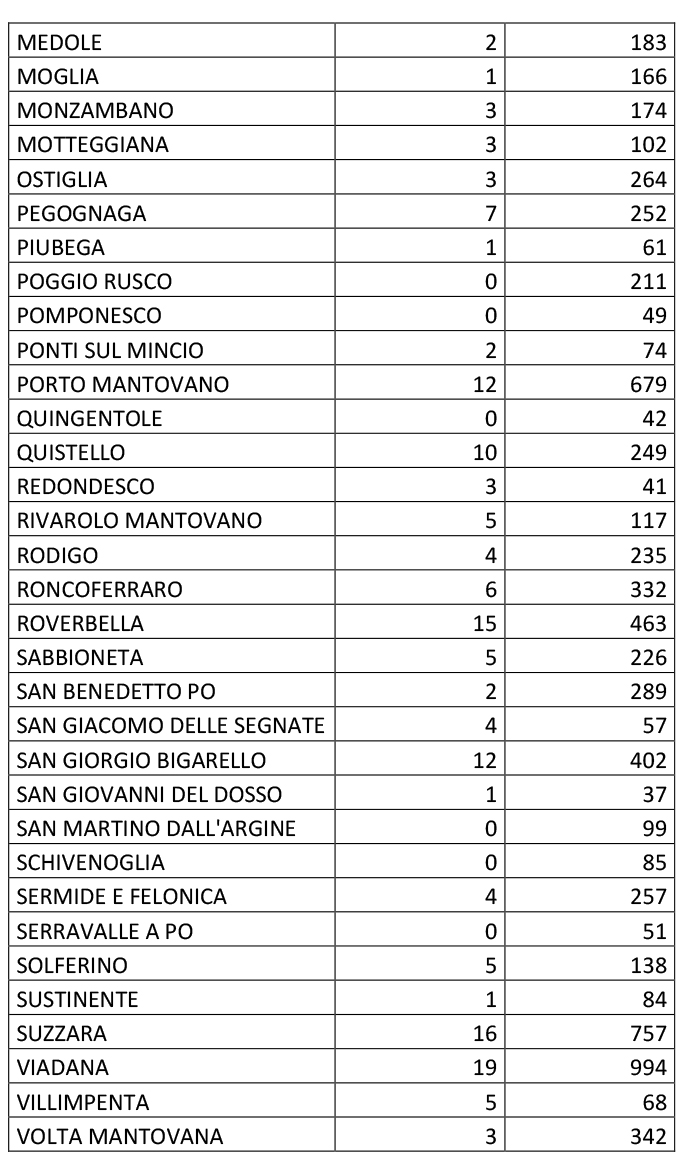 MANTOVA Mantova Sono 368 i nuovi casi di positività registrati nel Mantovano secondo il bollettino redatto da Ats e Prefettura. Con 65 positivi il Comune di Mantova registra il maggior incremento seguito a notevole distanza da Bagnolo San Vito fermo a 21. Viadana (vicina a superare il migliaio di positivi) fa segnare 19 casi. In doppia cifra si notano anche i Comuni di Curtatone con 18, Suzzara 16, Roverbella 15, Marmirolo 14, Porto Mantovano e San Giorgio Bigartello 12, Quistello 10.