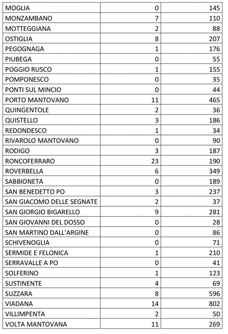 CronacaTop-CronacaTop-Home Covid, i nuovi casi sono 257 4 Dicembre 2020 Share FacebookTwitterPinterestWhatsAppEmailTelegram MANTOVA Sono 257 i casi di Covid registrati ieri in provincia di Mantova con picchi a Mantova città 39) e Roncoferraro 23). In doppia cifra anche Porto Mantovano, Canneto sull Oglio, Viadana e Volta Mantovana.