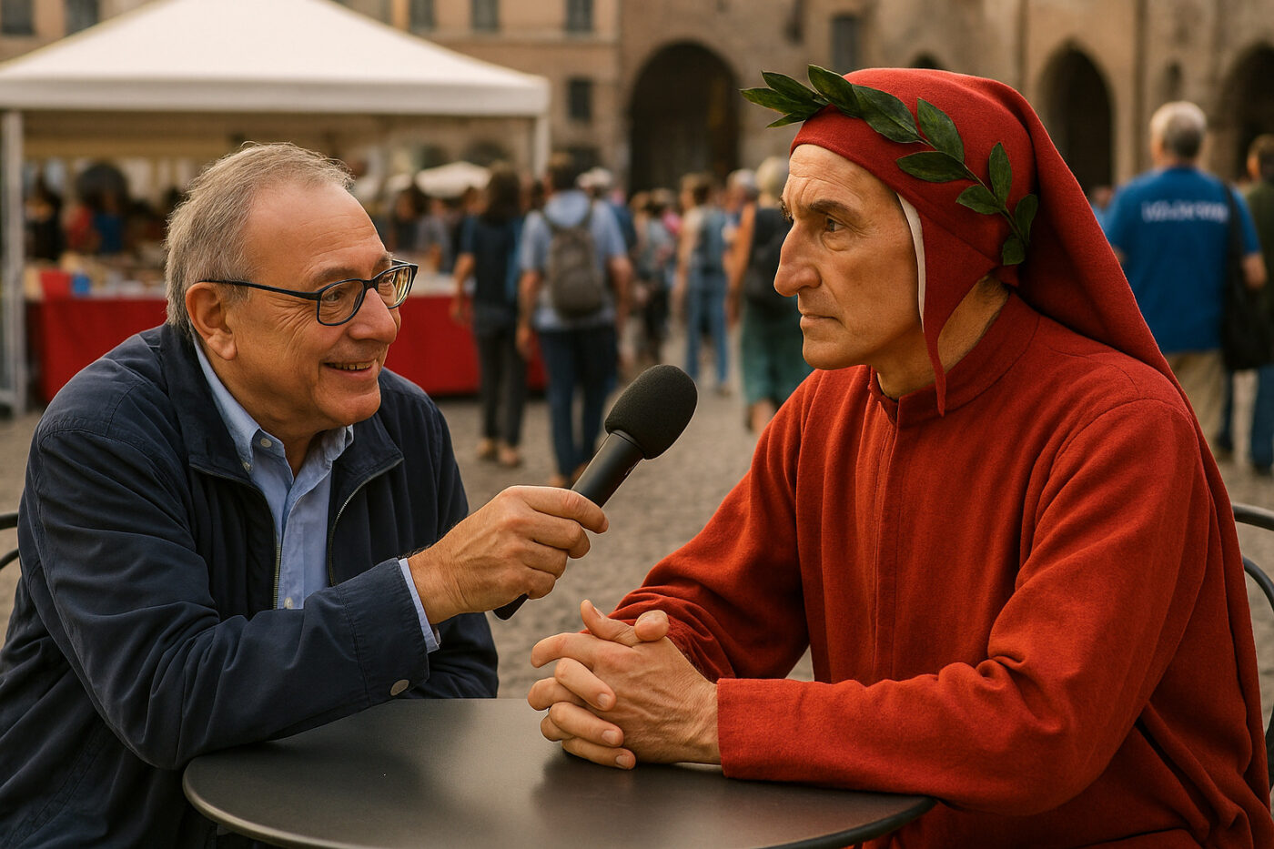 Al Festivaletteratura di Mantova passano moltissimi scrittori tranne quelli morti prima del 1997 quando tutto ebbe inizio. Ma sarebbe fantastico riuscire a far partecipare qualcuna delle star passate della letteratura, magari transitati per Mantova o che l’hanno semplicemente citata. Come potrebbe essere un’intervista ai tavolini di un bar di piazza Sordello, vicino alla tenda dei libri e in mezzo alla folla di scrittori, lettori e volontari? Immaginiamo di partire con Dante Alighieri, che forse è passato da Mantova nel 1320 e non ci mette piede da allora quando c’erano i Bonacolsi, non c’era piazza Sordello, c’era la Rotonda di San Lorenzo ma non la cupola di Sant’Andrea. Arriva puntuale e si presenta vestito così come lo vediamo nei quadri, tunica scarlatta, cappuccio e sguardo corrucciato: l’intervista può cominciare…