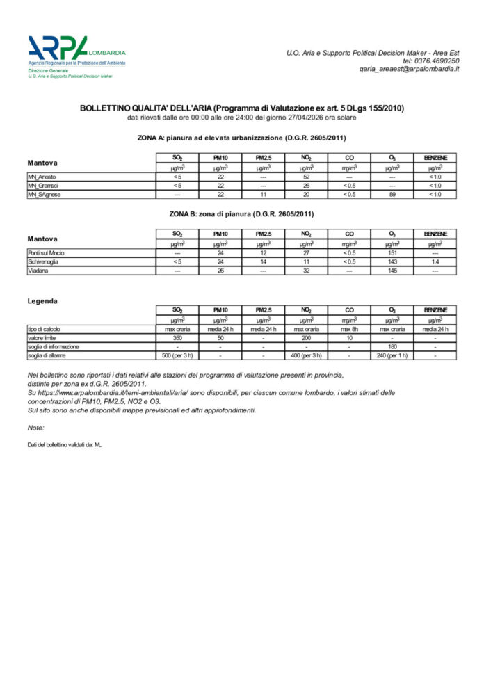 Nel bollettino sono riportati i dati relativi alle stazioni del programma di valutazione presenti in provincia, distinte per zona ex d.G.R. 2605/2011. Su www.arpalombardia.it/temi-ambientali/aria/ sono disponibili, per ciascun comune lombardo, i valori stimati delle concentrazioni di PM10, PM2.5, NO2 e O3 e i valori misurati nelle stazioni fisse non facenti parte del programma di valutazione