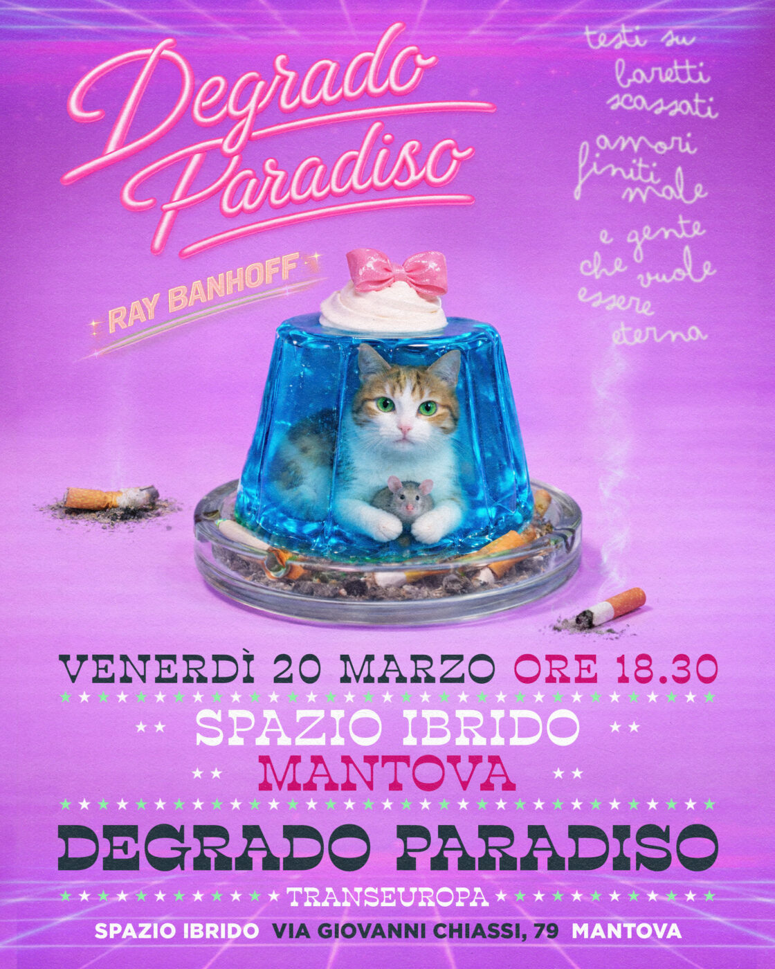 MANTOVA – Un viaggio poetico dentro la generazione dei quarantenni senza rendita né gloria, sospesi tra lavori necessari e sogni mai del tutto estinti: è questo il cuore di Degrado Paradiso, il nuovo “romanzo di versi” di Ray Banhoff, edito da Transeuropa, che verrà presentato il 20 marzo alle 18:30 nello spazio Forme – Spazio Ibrido di via Chiassi 79.Con l’autore dialogherà lo scrittore Davide Bregola, che ha curato il testo. Banhoff racconta una provincia italiana fatta di bar e gratta e vinci, di strade dritte che portano sempre altrove, di amori finiti e lavori che non bastano mai. Una quotidianità senza eroismi, dove la sopravvivenza è già una forma di resistenza, anche se nessuno la chiamerebbe così. I suoi versi sono fendenti: ironici, disperati, pop, capaci di illuminare l’umano proprio dove sembra essersi dissolto. Dietro lo pseudonimo Ray Banhoff c’è Gianluca Gliori, classe 1982, toscano, scrittore e fotografo. Dopo anni di collaborazioni con L’Espresso, Rolling Stone Italia, Style e Playboy, e un’intensa attività come fotografo per Radio 105, Virgin Radio e RMC, ha lasciato Milano per tornare in Toscana, laurearsi in Lettere e dedicarsi all’insegnamento. Oggi lavora nella scuola primaria e media, collabora con IED Firenze e porta avanti una produzione letteraria sempre più riconoscibile. Degrado paradiso è la sua nuova creatura: un poema cut-up che mescola storie minime, filosofia sporca e lampi di visione. L’incontro è parte di un progetto di Smartidea e offre l’occasione per scoprire una voce poetica che racconta la nostra epoca senza filtri, con una sincerità che brucia e consola allo stesso tempo.