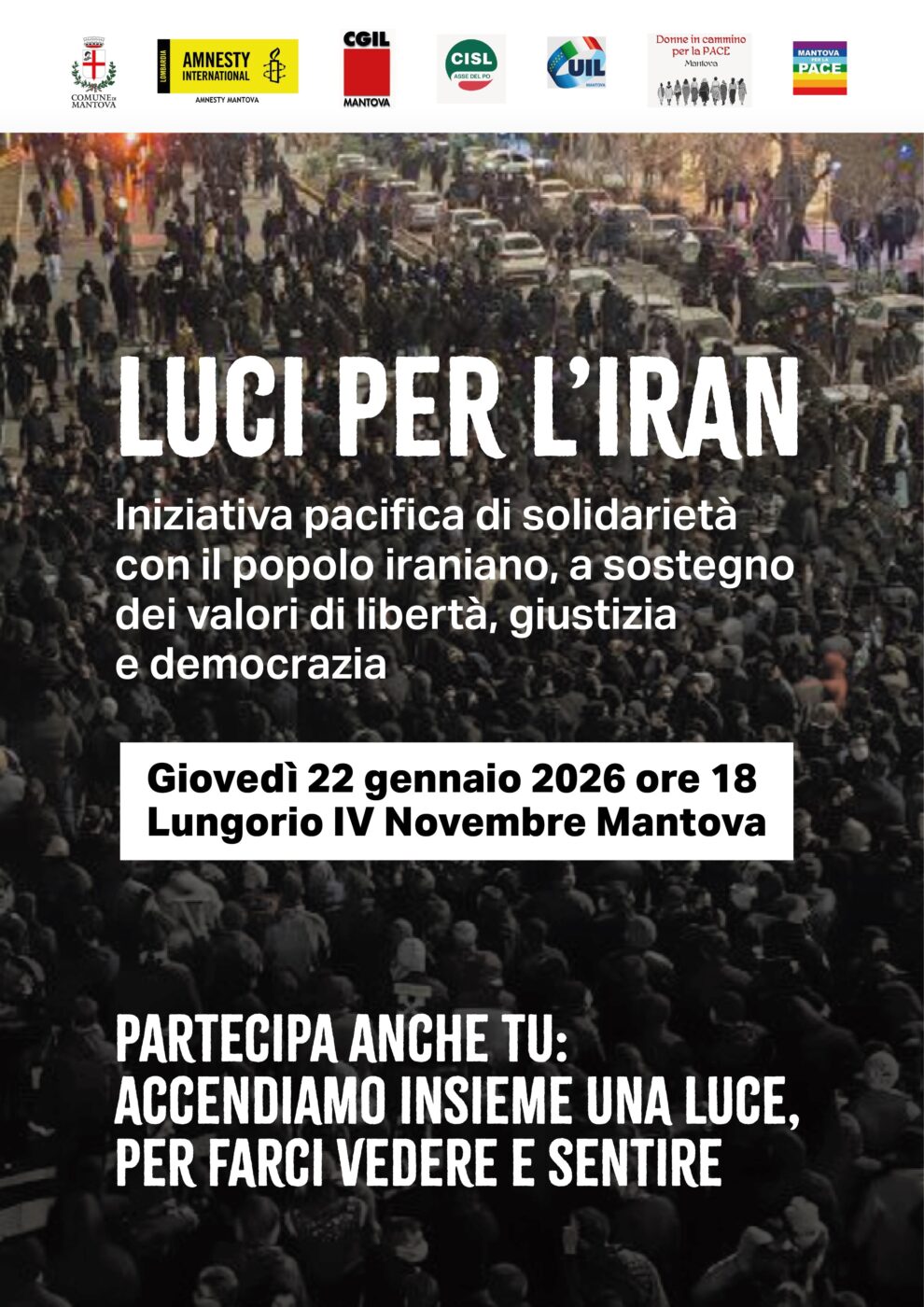 Giovedì 22 gennaio, alle 18, presso il Lungorio IV Novembre si svolgerà “Luci per l’Iran”, iniziativa pacifica di solidarietà con il popolo iraniano, a sostegno dei valori di libertà, giustizia e democrazia.