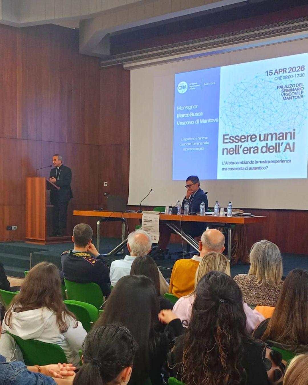 Non dobbiamo aver timore dell’intelligenza artificiale ma dobbiamo essere ben consapevoli che non può e non deve sostituire l’intelligenza umana : è questo l’argomento chiave del riuscito convegno promosso dalla Cna con il patrocinio dell’ Ospedale Carlo Poma , di Asst Mantova – Regione Lombardia e del Comune e della Provincia di Mantova che si è tenuto in una sala gremita di studenti e cittadini al Palazzo Vescovile . Dopo i saluti del presidente di Cna Mantova, Nicola Dall’Argine, e del presidente della Provincia, Carlo Bottani, a introdurre l’incontro è stato il segretario regionale di Cna Lombardia, Stefano Binda, che ha coinvolto gli studenti dell’Azienda Formazione Mantova – For.Ma. In sintesi è seguito l’intervento del vescovo Marco Busca che ha posto l’accento sul ruolo dell’intelligenza artificiale nella società contemporanea che non può sostituirsi alle indicibili capacità di sentire, di provare emozioni, di vivere nel mondo, di cercare un senso al proprio destino dell’essere umano. A differenza di un algoritmo, che segue regole predefinite per elaborare dati, la mente umana è capace di intuizione, creatività, di provare emozioni , di cercare un senso al proprio destino umano ha sottolineato il Vescovo Busca . IL Vescovo ha fatto riferimento all’anima come simbolo della trascendenza umana, della coscienza e della vita interiore, ambiti che sfuggono alla misurazione quantitativa e alla simulazione digitale. L’uomo è un essere relazionale, capace di empatia, amore e ironia, elementi che un algoritmo può simulare ma non “vivere” o comprendere realmente. L’Intelligenza Artificiale pone una sfida: non deve sostituire l’umano, ma integrarsi per il bene comune, mantenendo la centralità della dignità e della libertà della persona. Un appello ai giovani a non ridurre l’esperienza umana a dati e calcoli, riconoscendo la profondità e la “sacralità” dell’umano di fronte alla tecnologia. Occorre mantenere un ragionevole equilibrio di atteggiamento alle nuove tecnologie , che possono favorire l’evoluzione dell’umanità nei campi professionali, produttivi e culturali ha concluso il Vescovo Busca Successivamente sono intervenuti la psicologa Elena Soncina, del Ser.D di Mantova, che ha preso in esame di come evitare uno “scollamento” tra emozioni e algoritmi; l’avvocato Andrea Rossato si è soffermato sulle nuove truffe digitali e sulle manipolazioni online; infine, e l’informatico Alberto Bertini ha evidenziato benefici e rischi concreti legati all’ingresso dell’intelligenza artificiale nelle aziende contemporanee.