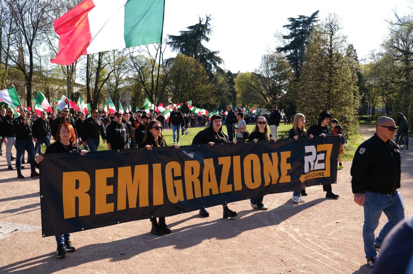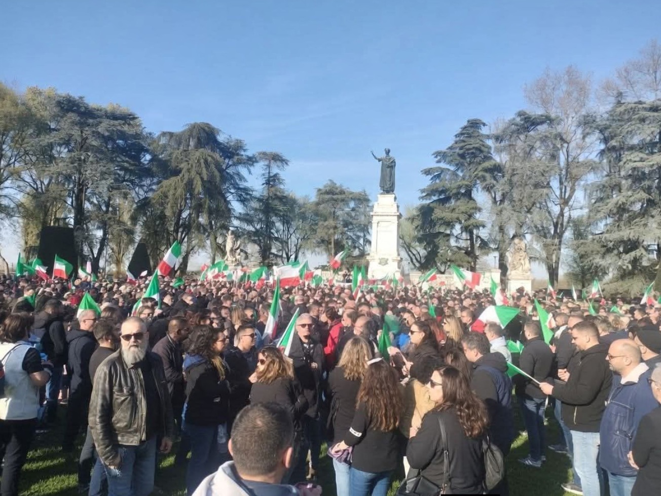 MANTOVA I cori si sono sentiti molto prima di vedere il corteo. Poi, da via Trento, con piazza Filippini sullo sfondo, è emersa la marea: giubbotti neri, jeans, anfibi, bandiere tricolori e uno striscione con la grande scritta Remigrazione in testa. Un gruppo compatto, ordinato, che avanzava verso la statua di Virgilio, nel cuore di piazza Virgiliana. Colpo d’occhio netto, soprattutto per la presenza di molti giovani, alcuni riconducibili all’area skinhead, affiancati da un servizio d’ordine interno, che hanno scandito per tutto il percorso gli slogan: «Dal centro città a ogni quartiere, Mantova è nostra e ci appartiene». Fino all’Inno di Mameli, intonato all’arrivo in piazza, sotto il presidio mobile, all’ombra della statua del sommo poeta. Secondo gli organizzatori erano circa 600 i partecipanti, tra cui gruppi provenienti anche da fuori provincia.