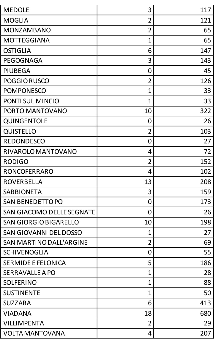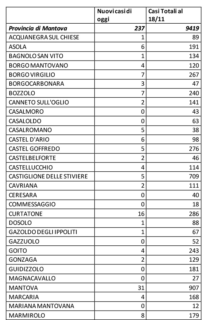 MANTOVA Aumento di 237 unità per quanto riguarda i positivi nella provincia di Mantova secondo il bollettino emesso dalla Prefettura. Il maggior numero di contagi viene rilevato a Mantova con 31 casi seguito da Curtatone con 16. In doppia cifra anche i Comuni di Porto, Roverbella, San Giorgio e Viadana.
