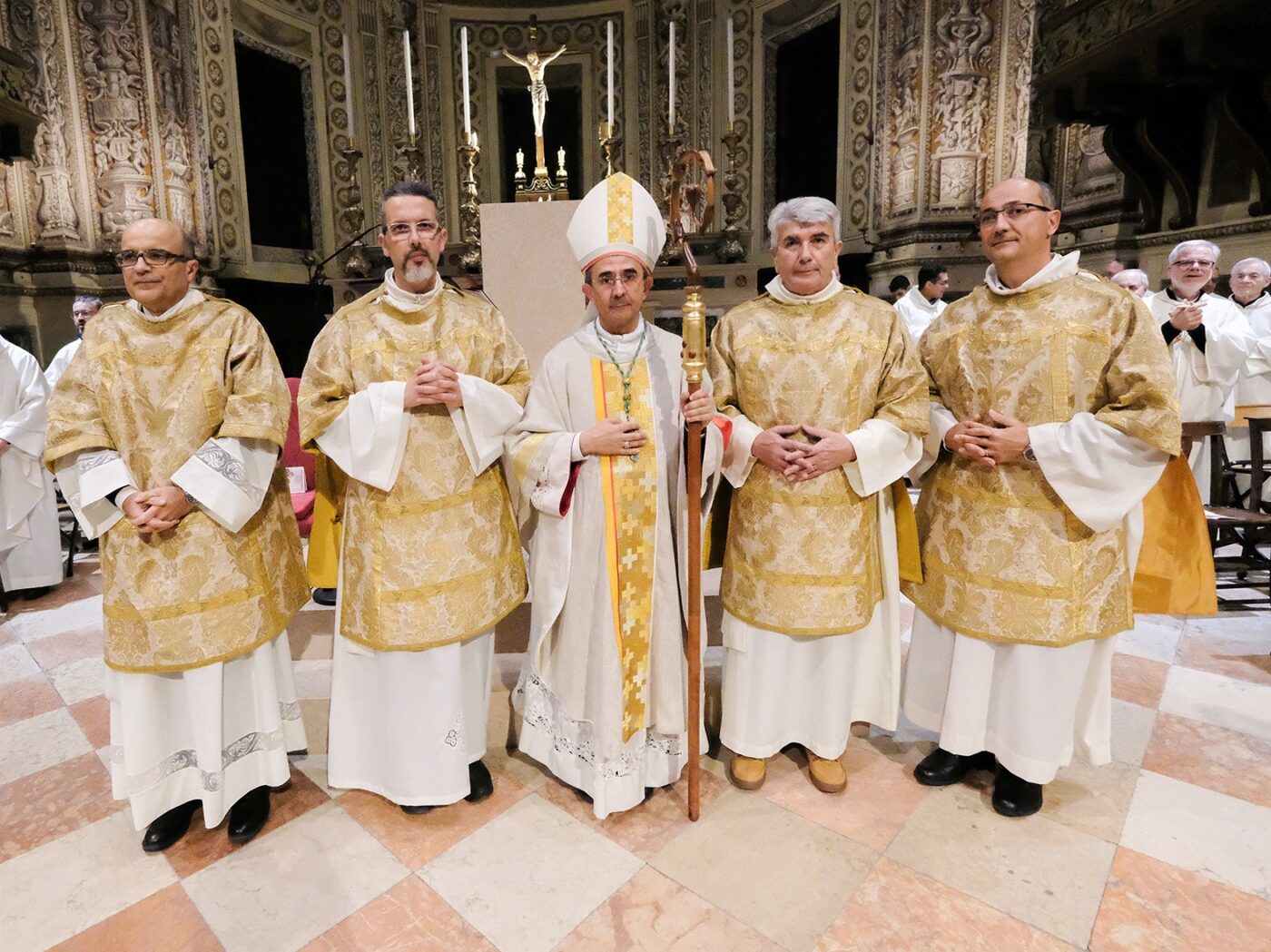 MANTOVA Lunedì nella basilica di Sant’Andrea sono stati ordinati diaconi permanenti Roberto Savoia, della parrocchia di San Benedetto Po; Alberto Guardini, della parrocchia di Monzambano; Ernesto Calzolari e Riccardo Barbera della parrocchia di Levata di Curtatone. Il loro percorso di formazione al Diaconato è stato ritmato dalla loro partecipazione all’Istituto Superiore di Scienze Religiose San Francesco (ISSR) di Mantova in relazione al programma di formazione definito dalla Diocesi. Contestualmente alla loro formazione teologica, pastorale ed esegetica, vi è stato un accompagnamento spirituale, sia individuale che come gruppo, per approfondire tematiche specifiche che legano l’uomo alla sua interiorità, al suo credere più profondo. La formazione è stata rafforzata da Esercizi, Ritiri e incontri mensili con i diaconi già ordinati.