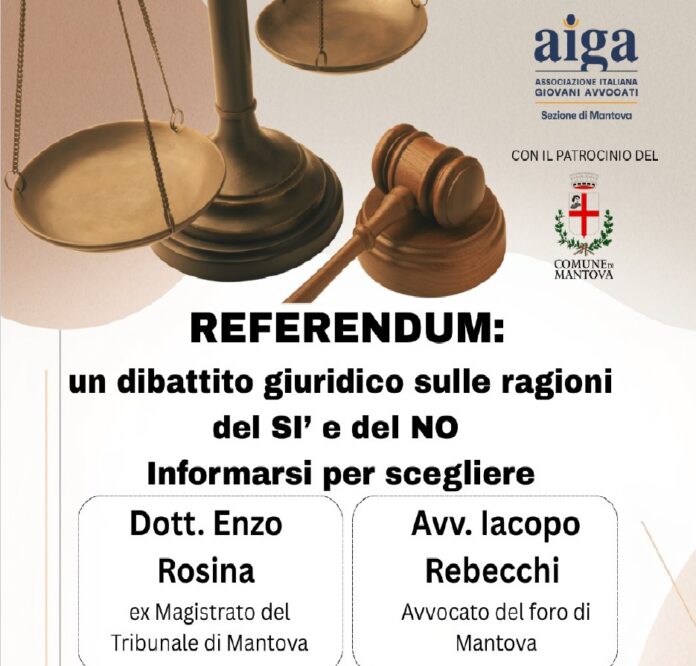 MANTOVA Dopo la presentazione, nelle scorse settimane di due comitati di avvocati a Mantova a sostegno uno per il Si e l’altro per il No al referendum sulla Giustizia del prossimo 22 e 23 marzo, ecco l’iniziativa bi-partisan per spiegare le ragioni di entrambe le posizioni. A tal proposito si terrà nella giornata di oggi, mercoledì 4 marzo, il convegno organizzato dalla sezione di Mantova della Associazione Giovani Avvocati dal titolo “un dibattito giuridico sulle ragioni del Si e del No – informarsi per scegliere”. A confrontarsi saranno l’avvocato Iacopo Rebecchi – già presidente Aiga (Associazione Italiana Giovani Avvocati) di Mantova e il dottor Enzo Rosina – già Magistrato del Tribunale di Mantova. A moderare l’incontro sarà l’avvocato Silvia Ebbi, presidente di Aiga Mantova. L’evento, rivolto sia agli avvocati che alla cittadinanza, inizierà alle 17.30 presso la Sala degli Stemmi di Mantova. Patrocinato dal Comune di Mantova, l’incontro vuole offrire un’occasione per informarsi e comprendere, attraverso un dibattito tecnico e qualificato, le diverse posizioni a confronto.