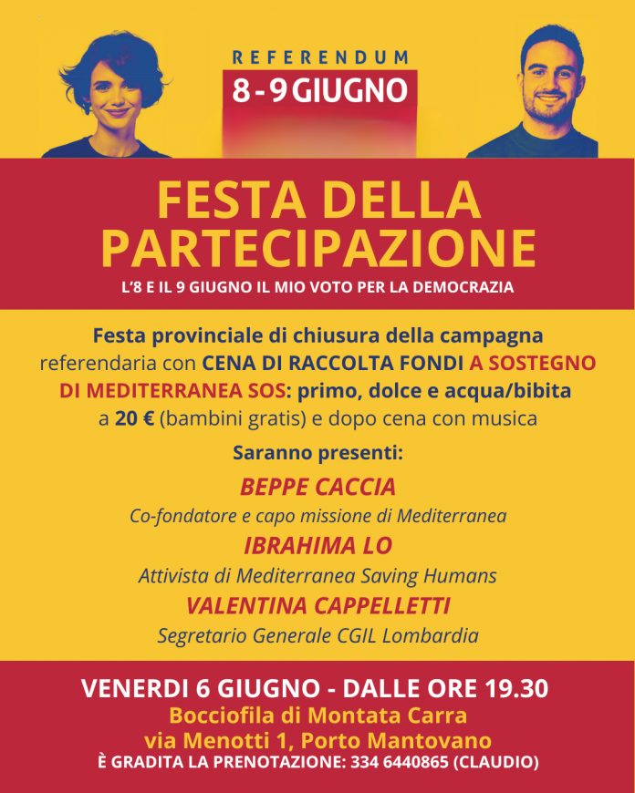 Venerdì 6 giugno alle ore 21 nella sala civica delle scuole medie in via Lisiade Pedroni di Gonzaga, spazio all’incontro pubblico “Più diritti e più tutele per le lavoratrici e i lavoratori, più sicurezza nei luoghi di lavoro” con Antonella Bernardelli (segretaria circolo Pd Gonzaga), mentre alle ore 19.30, come anticipato, la bocciofila di Montata Carra (via Menotti 1) ospiterà la “Festa della Partecipazione” per la chiusura campagna referendaria con cena di raccolta fondi a sostegno di Mediterranea SOS: primo, dolce e acqua/bibita 20 euro (bambini gratis) e dopo cena con musica. Saranno presenti Beppe Caccia (co-fondatore e capo missione di Mediterranea), Ibrahima Lo (Attivista di Meditteranea Saving Humans), Valentina Cappelletti (Segretaria Generale Cgil Lombardia).