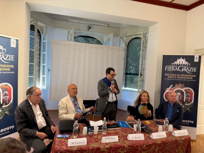 GARDONE Un ponte tra le sponde del Lago di Garda e le rive del Mincio, tra cultura, arte e spiritualità: è in questo spirito che nella prestigiosa cornice del Vittoriale degli Italiani di Gardone Riviera (Bs), grazie alla collaborazione con la Comunità del Garda e GardaMusei, si è svolta la presentazione ufficiale del seicentenario dell’Antichissima Fiera di Grazie di Curtatone (Mn), in scena dal 14 al 17 agosto, e del 51° Incontro nazionale dei Madonnari, sul tema “Le Madonne del mondo” (14-15 agosto). Sono intervenuti Carlo Bottani, sindaco di Curtatone e presidente della Provincia di Mantova, Annalisa Baroni, delegata di Presidenza della Comunità del Garda, Pierlucio Ceresa, segretario generale Comunità del Garda, Mauro Carrozza, presidente di GardaMusei, Enrico Volpe, consigliere delegato della Provincia di Mantova alla cultura e al turismo e membro del Consiglio direttivo della Comunità del Garda, e Giordano Bruno Guerri, presidente del Vittoriale degli Italiani.