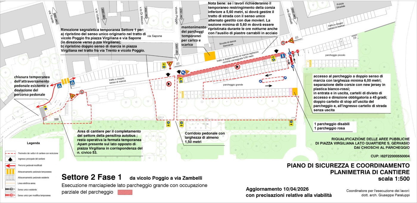 I lavori affidati alla Goitese costruzioni di Marmirolo hanno avuto la concessione di occupazione del suolo pubblico sino al 27 giugno, data tecnica per il fine lavori sul lato del quartiere San Gervasio dai chioschi al parcheggio. Il tutto per un importo di circa mezzo milione di euro. Un altro mezzo milione è messo a bilancio per gli interventi di completamento, compresi gli impianti di illuminazione, telecamere e quant’altro. Transenne e benne sono già al lavoro.