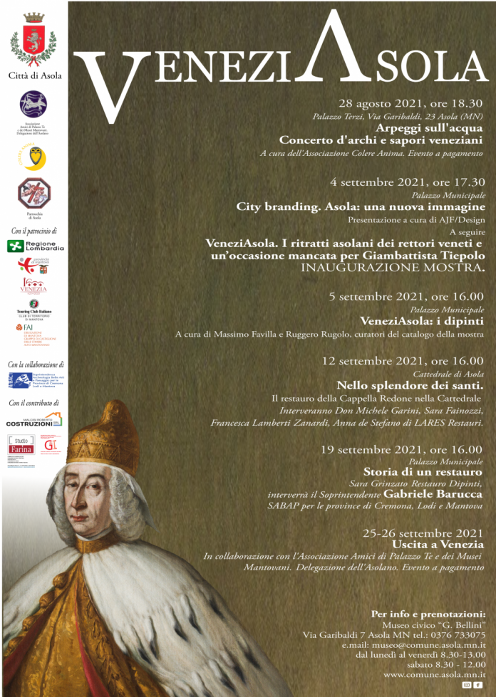 Il 4 settembre presso il Museo civico “G. Bellini” sarà inaugurata la mostra “VeneziAsola. I ritratti asolani dei rettori veneti e un’occasione mancata per Giambattista Tiepolo”. Per l’occasione sarà presentato presso il Palazzo Municipale da AJF/Design il nuovo brand della città, un logo che rappresenterà Asola, la sua storia e le sue peculiarità tra passato e presente.