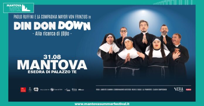 MANTOVA Tutti conoscono “Up&Down”, il varietà con Paolo Ruffini e gli attori della Compagnia Mayor Von Frinzius che, dal suo debutto nel 2018, ha incantato il pubblico di tutta Italia. Perché “Up & Down” non è solo uno spettacolo comico, un progetto rivoluzionario, un modello di teatro alternativo, ma un vero e proprio fenomeno culturale che ha conquistato anno dopo anno un suo spazio nell’immaginario collettivo e nel patrimonio artistico italiano, con oltre 200 repliche in tutta Italia e più di 120mila biglietti venduti. Ruffini e la Compagnia faranno tappa a Mantova nella splendida cornice dell’Esedra di Palazzo Te il 31 agosto per il Mantova Summer Festival organizzato da Mister Wolf in collaborazione col Comune di Mantova e Palazzo Te e con La Casa del Sole che quest’anno compie 60 anni di accoglienza. Paolo Ruffini e gli attori della Compagnia Mayor Von Frinzius hanno deciso di voler superare sé stessi con lo spettacolo, “Din Don Down – Alla ricerca di (D)io”: un nuovo happening comico, senza regole, che sovverte il senso più profondo di ciò che ci ostiniamo a definire “normale”, con l’obiettivo di sorprendere e incantare attraverso il giusto mix tra comicità, disobbedienza e tenerezza che già aveva segnato il successo di “Up&Down”. La vera novità sta nel tema al cuore dello show: laddove “Up&Down” compiva un’indagine sull’amore, “Din Don Down” abbraccia un nuovo grande concetto, quello di Dio.