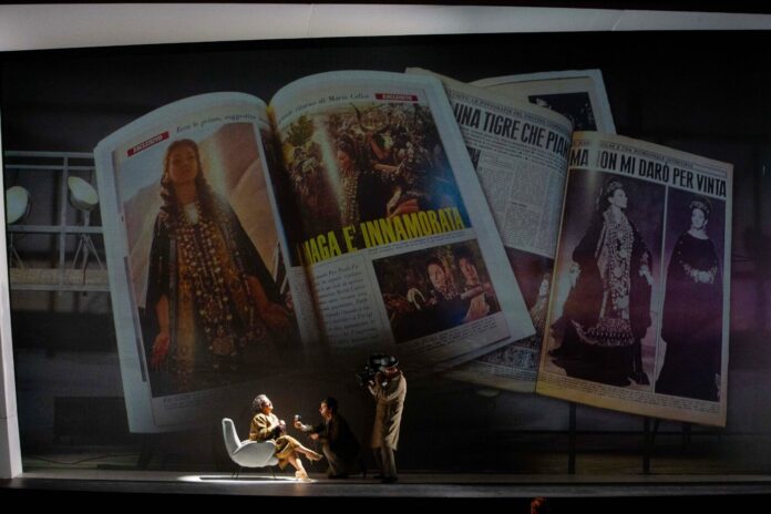 Un’operazione rischiosa, quando si affronta il mito Callas, ma riuscita, perché non guarda con nostalgia al passato, ma si riflette sul presente. Il libretto dell’opera scritto da Alberto Mattioli, critico musicale acuto e caustico, fa la cronaca di questa grande attrazione che aveva riempito le pagine di tutti i giornali dell’epoca, e la trasforma in una profonda riflessione a proposito dell’amore diverso, dell’amore impossibile tra un noto omosessuale e la primadonna per antonomasia, qui riportata al suo essere donna che, amata da un pubblico sconfinato di ammiratori, nella vita vive grandi delusioni. «Uomini! Sempre tutto e subito. E poi… e poi… finisce» si rammarica la Callas di Mattioli nel monologo del primo atto; il rapporto con Onassis? «Nove anni buttati», poca considerazione per il primo marito Meneghini, cosa avrebbe detto dell’ «osceno» film Teorema di Pasolini lui che «già faticava con le opere». «Pier Paolo è buono» si convince.