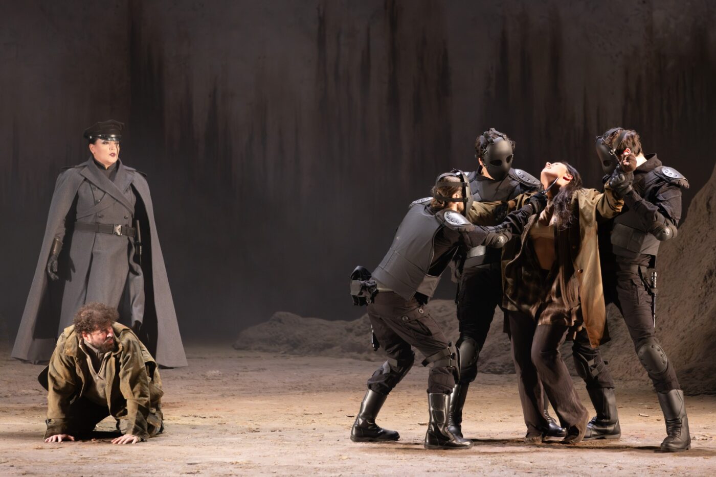 MANTOVA Quello immaginato da Federico Grazzini nella prima tappa del tour lombardo di Nabucco, al Ponchielli di Cremona lo scorso fine settimana – in realtà, un’appendice postuma sarà a Lucca, a gennaio – è un mondo il giorno dopo l’apocalisse. Un regno dei morti in cui tutto è macerie, fumo, offesa. In un non luogo e in un non tempo che troppo assomiglia a molti luoghi di questo nostro tempo insanguinato, nel grigiore che pervade il cielo e lo rende dello stesso colore della terra, si aggirano neri soldati come automi, tutti maschere e tute futuristiche. Presidiano una terra di nessuno, si accaniscono su poveri inermi sfuggiti al massacro. Denudano una donna, rapiscono una bambina, legittimati dal potere di cui sono braccio armato. La Sinfonia d’apertura, esaltata dal bel gioco di luci a firma di Giuseppe di Iorio, già disegna il perimetro di una visione chiaroscurale che scardina la collocazione storica della vicenda e la sospende in un’ambiguità spaziotemporale in cui l’assenza di riferimenti non è sottrazione ma laico, universale messaggio, accorato grido ad una possibile comune redenzione, alla venuta di un giorno nuovo in cui la riconciliazione sia possibile. I costumi di Anna Bonomelli sembrano affiorare dalla pece: il popolo d’Israele, lacero e afflitto, attende la propria sorte in gabbie metalliche, mentre è costretto a cantare inni all’usurpatore. I Babilonesi, a partire da Abigaille – una Kristina Kolar potente nell’emissione ma non omogenea nel cambio di registro e in più momenti in evidente affanno rispetto all’improba parte – sfoggiano la loro protervia in abiti militareschi, vagamente nazisti, che ne strizzano le forme. Fa eccezione Nabucco – un Angelo Veccia sempre magnifico, a dispetto di un suono a tratti coperto e di un vibrato fin troppo generoso, nel cesellare frasi e accenti, nello scolpire coi minimi gesti, ancor prima che con la fine duttilità dello strumento vocale, la parola scenica verdiana – la cui conversione, qui concepita nel suo senso letterale, ancor prima che religioso, viene esplicitata con la spoliazione dei suoi emblemi regali a favore di miseri brandelli insanguinati. Nelle scene d’insieme in cui le masse corali, piuttosto opache nella resa esecutiva, si muovono con macchinosa affettazione, lui si aggira smarrito, vinto tra i vinti. Non lo sa, ma è già uno di loro. Com’è una di loro Fenena, un’intensa Mara Gaudenzi dal timbro brunito e morbido, contrappuntata dall’esuberante Ismaele di Marco Miglietta. Statuario, poi, lo Zaccaria vellutato e autorevole, di Peter Martinčič, ben proiettato in ogni zona della sua ampia tessitura. La sua è pura voce di preghiera e di profezia. Corretta quanto misurata e asciutta, tanto da sconfinare nel pallore – di colori, di passo, di mordente – la conduzione di Valerio Galli alla testa dell’Orchestra I Pomeriggi Musicali. Il prossimo fine settimana si replica al Grande di Brescia.