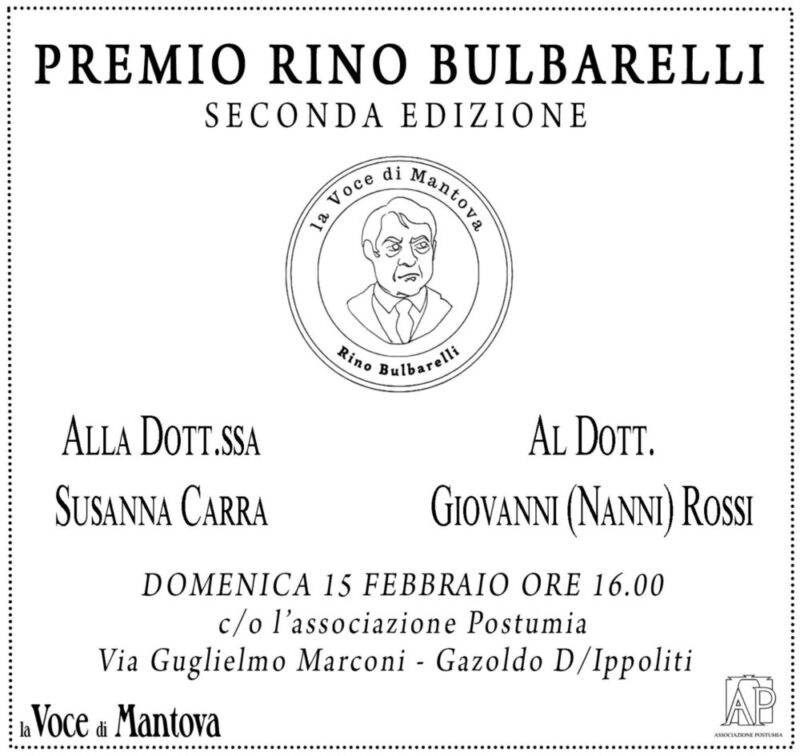 GAZOLDO Domenica 15 febbraio alle ore 16, nella suggestiva cornice della Rocca Palatina di Gazoldo degli Ippoliti, si rinnoverà l’appuntamento con l’assegnazione del Premio Rino Bulbarelli, promosso dal quotidiano la Voce di Mantova in collaborazione con l’associa zione Postumia.