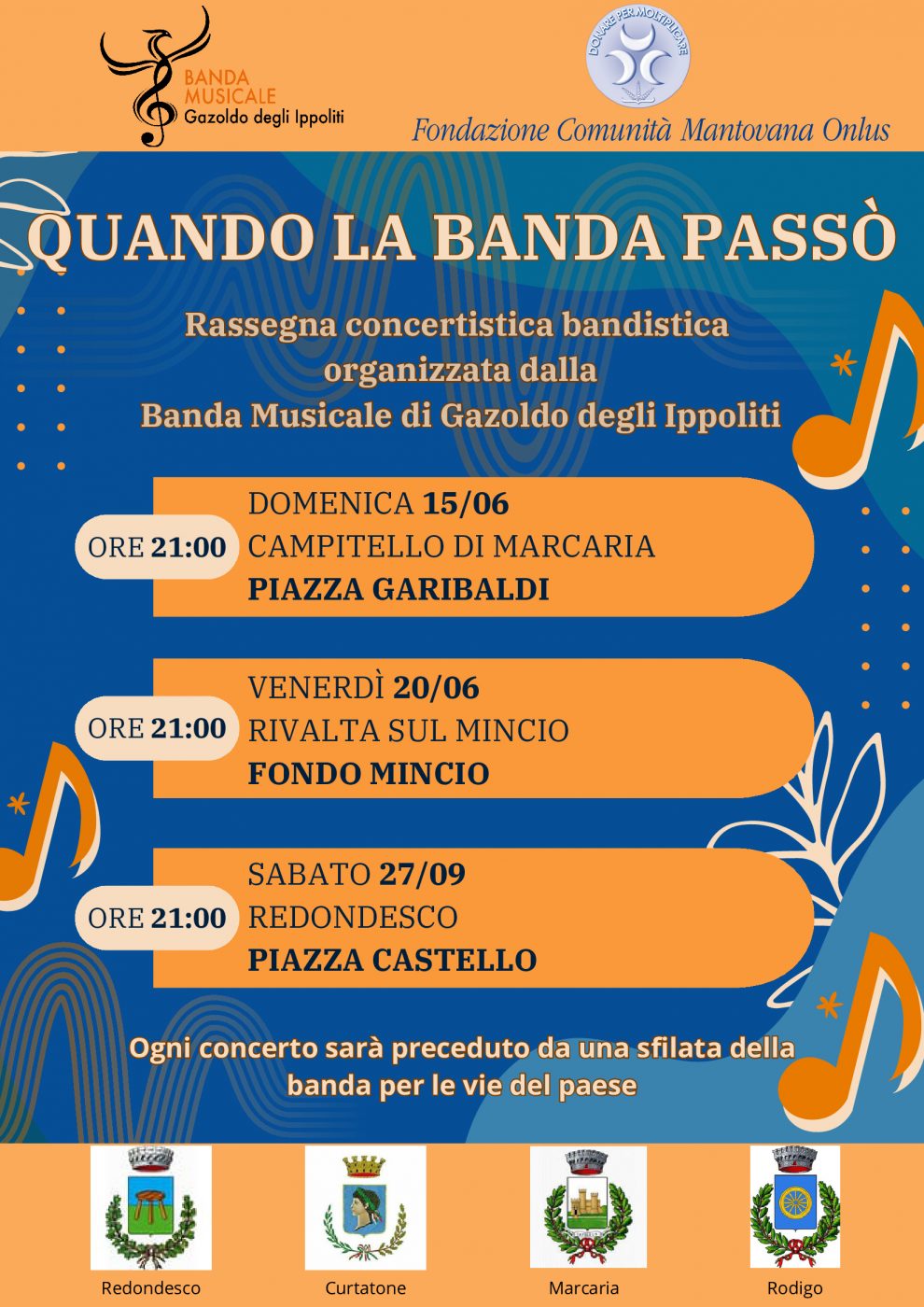 GAZOLDO Dopo il successo ottenuto a fine maggio con la favola in musica a Grazie di Curtatone, la banda musicale di Gazoldo degli Ippoliti prosegue il proprio tour nei paesi limitrofi con la seconda data della rassegna concertistica bandistica “Quando la banda passò”, avente