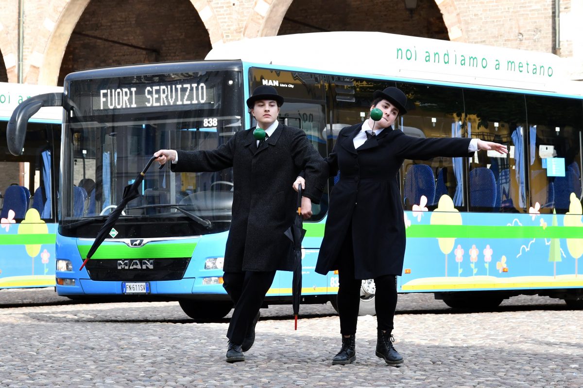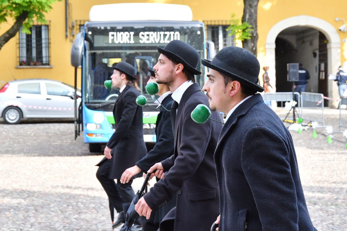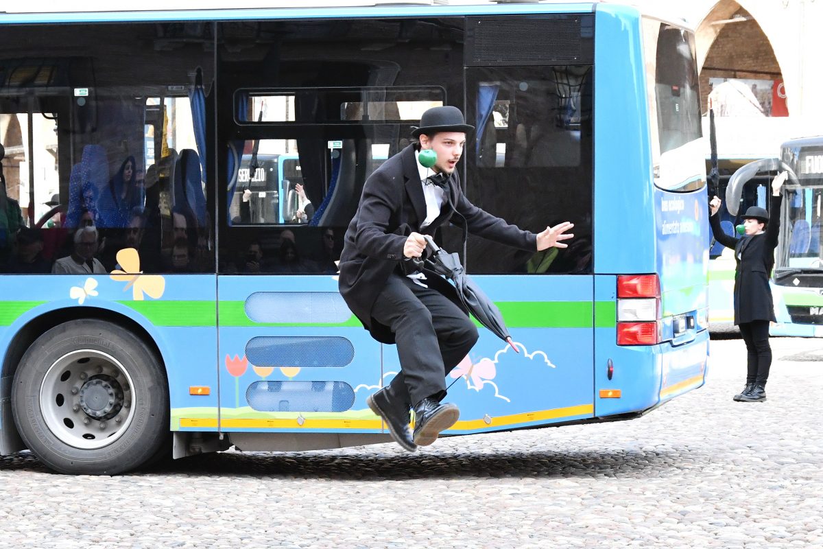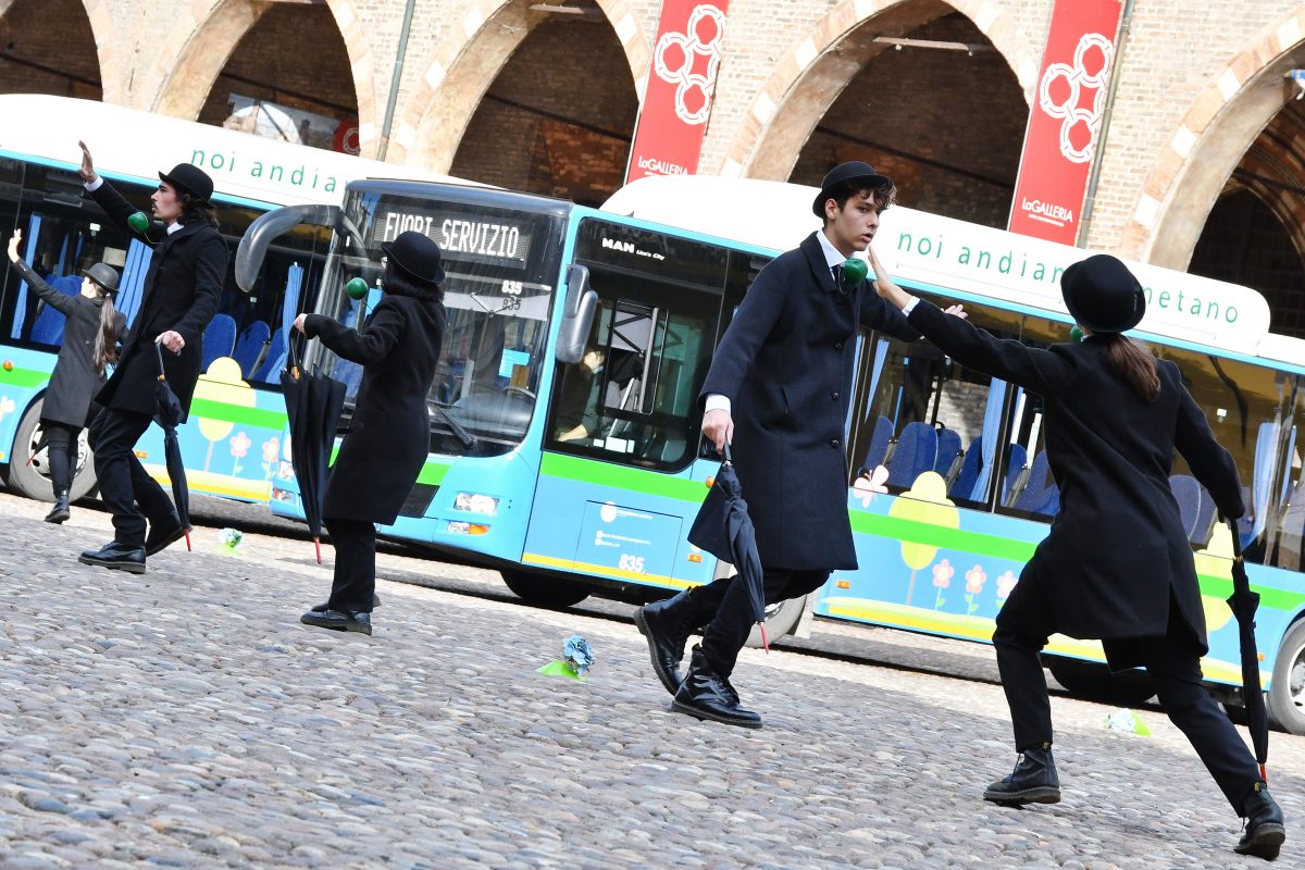 Una bombetta in testa, un classico abito nero, un ombrello e una mela davanti al viso, così gli attori di Teatro Magro si sono mossi per tutta la piazza a suon di musica interagendo con gli autobus formando una fantastica danza molto apprezzata dal folto pubblico che si è sistemato ai lati di piazza Sordello.