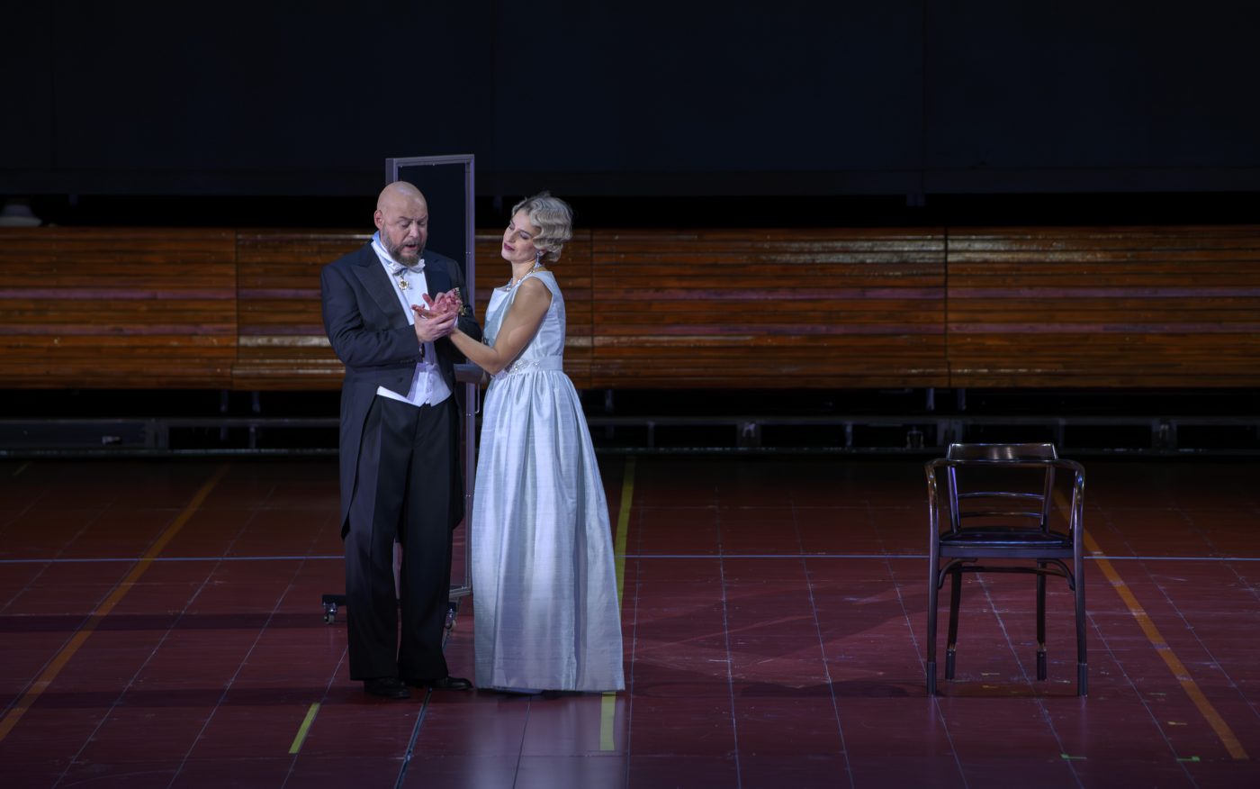 Una corsa in discesa, a freni rotti, a dimenticare il sangue versato con altro sangue da versare. Sfrenata e suicida, verso la disfatta, eccitata dal vento della profezia; una corsa spettacolare e spudorata, come senza pudore è la Lady che si spoglia e si riveste davanti ai nostri occhi, abbandonandosi ad una sigaretta via l’altra e a robuste bevute fino ad apparire, sfatta, arresa, oscena, mentre gira, barcollante, con il trucco sbavato, gli abiti stazzonati, con un abat jour in mano brandito come un pugnale, prima di tentare di uccidersi tagliandosi le vene. La fine è sul campo. Agonistica, non fisica. Non la morte ma la sconfitta: lui, demente, in carrozzina, ridotto ad un patetico, isterico automa. Lei legata a lui con il filo stesso della lampada. Catturati, irrisi. Costretti a subire un pubblico processo, a dare della loro nuova condizione di vinti indecente spettacolo, come il triste copione di ogni rovesciamento di potere richiede. Accanto ai due protagonisti, non meno luminose le prove di Banco, un Tareq Nazmi di raffinatissima caratura, e di Macduff, un Joshua Guerrero in gran spolvero, affiancati dal puntualissimo Malcolm di Davide Tuscano. E a condire, rifinire, esaltare l’abbacinante tela che Verdi ordisce sul tracciato shakespeariano, la lussureggiante buca in cui i Wiener, ancora una volta condotti in questa traversata (come nel 2023, allora in corsa, a sostituire Wesler Mὂst) dal braccio saldo e visionario di Philippe Jordan, accendono la partitura di un pathos così teso e incalzante da farla sembrare pagina nuova, rivelazione di prima mano. Tempi sostenuti a rendere il montare della tensione, il proverbiale legato d’antica scuola di marchio viennese, l’insieme saldato al fuoco di un comune sentire, costruito strato per strato nel tempo, l’oro fuso di strumentalità superlative a plasmare un suono che è metallo prezioso, fuoco che scalda, ma anche livida tinta di morte. Ottoni morbidissimi quanto, all’occorrenza, impietosi, archi folleggianti, fiati e percussioni infallibili. E, con l’orchestra, il coro. Una massa che circonda, come in una tragedia greca, la scena, la determina, la avvolge di una compattezza timbrica che è una stilettata al cuore. Peccato la dizione, per tutti – solisti compresi – complessivamente piuttosto faticosa e opaca. Con una maggiore chiarezza del testo, la proverbiale parola scenica verdiana avrebbe avuto la sua serata di grazia. In una ragnatela di suggestioni e di provocazioni di innegabile spessore, avrebbero allo stesso modo necessitato di qualche passaggio più esplicito anche i rimandi alle figure di Edipo di Sofocle e di Maria di Nazareth, lampeggianti attraverso i frammenti cinematografici tratti dai pasoliniani Edipo re e Vangelo secondo Matteo. Ma anche così, nella sua ridondante incompiutezza, questa regia dai tanti temi reticolari, dai mille spunti sapeva, se non pienamente convincere, di certo avvincere senza riserve. Ed è già molto.