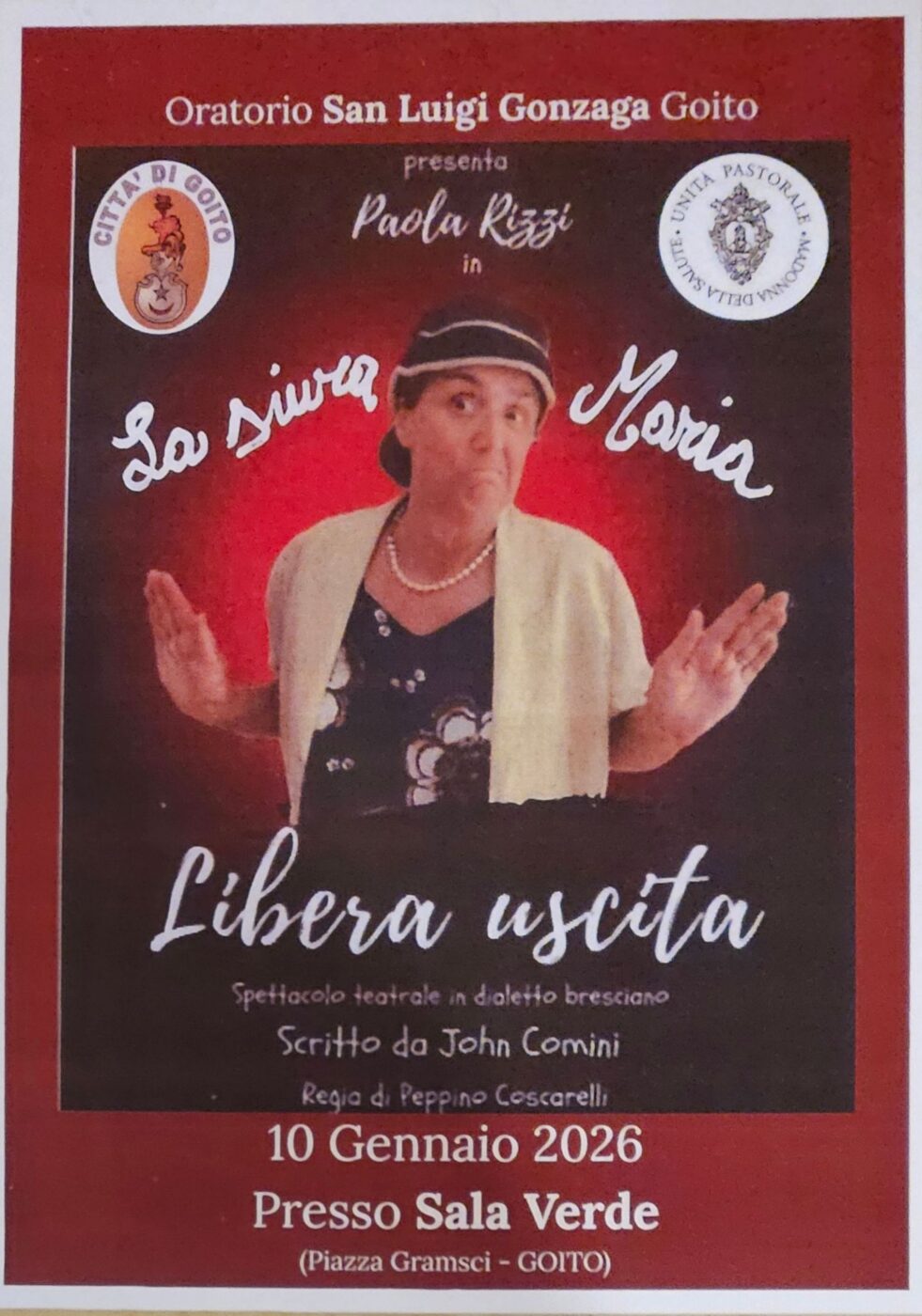 Protagonista di questo nuovo appuntamento sarà La Siura Maria, personaggio amatissimo del teatro comico-dialettale, presenza fissa in numerosi cartelloni sia in provincia che oltre i confini mantovani. Brillante mattatrice, la Siura Maria ha conquistato il pubblico grazie alla sua simpatia travolgente e ai suoi monologhi irresistibili, nei quali racconta episodi di vita vissuta, avventure sentimentali e situazioni quotidiane in cui molti si riconoscono. Il suo è uno spettacolo esilarante, vivace e coinvolgente, capace di far ridere fino alle lacrime e di regalare al pubblico una serata di pura leggerezza. L’Oratorio San Luigi Gonzaga è quindi lieto di presentare sabato 10 gennaio alle ore 20.45, presso la Sala Verde di Goito – gentilmente concessa dall’Amministrazione comunale – lo spettacolo “Libera uscita”, nuova imperdibile performance della Siura Maria.