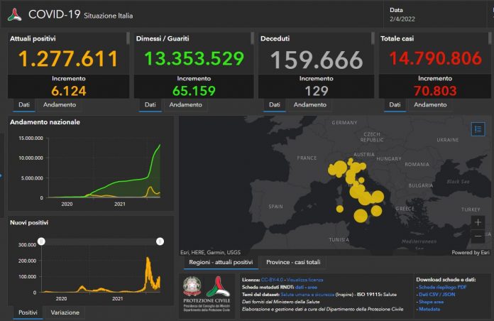 Nelle ultime 24 ore sono stati 129 i decessi (ieri 154), che portano il totale delle vittime da inizio pandemia a 159.666.