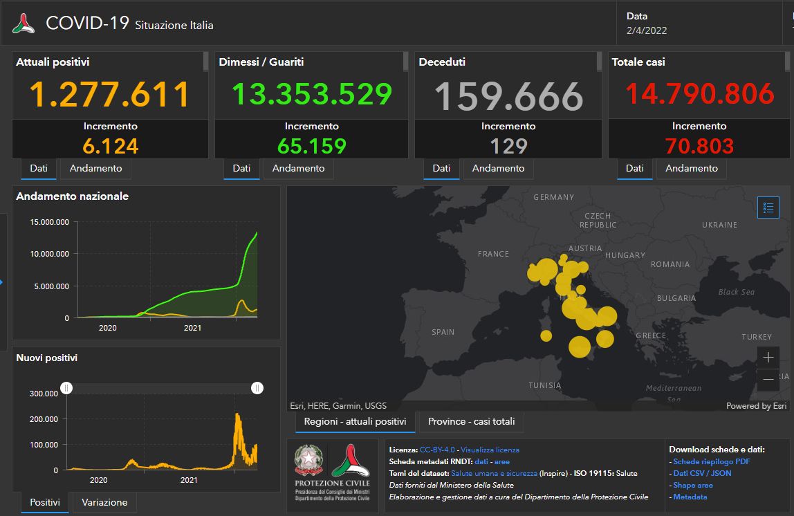 Con quelli di oggi diventano 14.790.806 i casi totali di Covid in Italia. Attualmente i positivi sono 1.277.611 (+6.124), 1.267.169 le persone in isolamento domiciliare. I ricoverati in ospedale con sintomi sono 9949 di cui 493 in Terapia intensiva. I dimessi/guariti sono 13.353.529 con un incremento di 65.159 unità nelle ultime 24 ore.