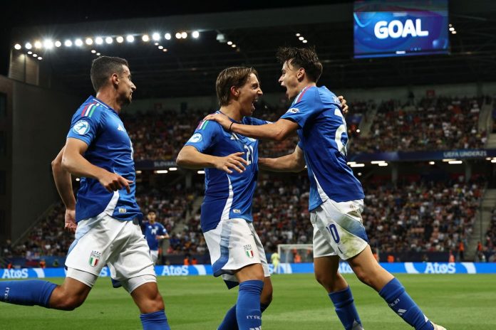 I ritmi, poi, si abbassano, e non ci sono più occasioni: il primo tempo, quindi, si chiude senza reti e con gli unici due tiri nello specchio della porta di marca azzurra. La Spagna parte meglio anche nella ripresa e trova il vantaggio dopo otto minuti: Doumbia arriva in ritardo su Moleiro, che può avanzare e servire Moro, il quale mette in mezzo per il rigore in movimento di Rodriguez, a sua volta un pò perso da Kayode. La reazione azzurra, però, è immediata: lancio lungo di Ghilardi per Pisilli, che controlla magistralmente in due tempi saltando Pablo Marin e battendo Cunat con un preciso diagonale rasoterra. Dopo una fase in cui le due squadre rifiatano, la partita si riaccende nel quarto d’ora finale. Zacchi se la cava su un tiro non pericoloso di Fernandez, mentre è più impegnativa la parata di Cunat all’82’ su un tiro angolato ma debole di Turicchia. All’89’, Casadei ha un’occasione di testa ma, invece di indirizzare verso la porta, cerca un’inspiegabile sponda, mentre Pisilli, poco dopo, manca di poco la porta con un tiro dal limite. L’Italia tornerà in campo domenica sera nei quarti di finale contro la vincente del Gruppo B (attualmente c’è la Germania in testa).