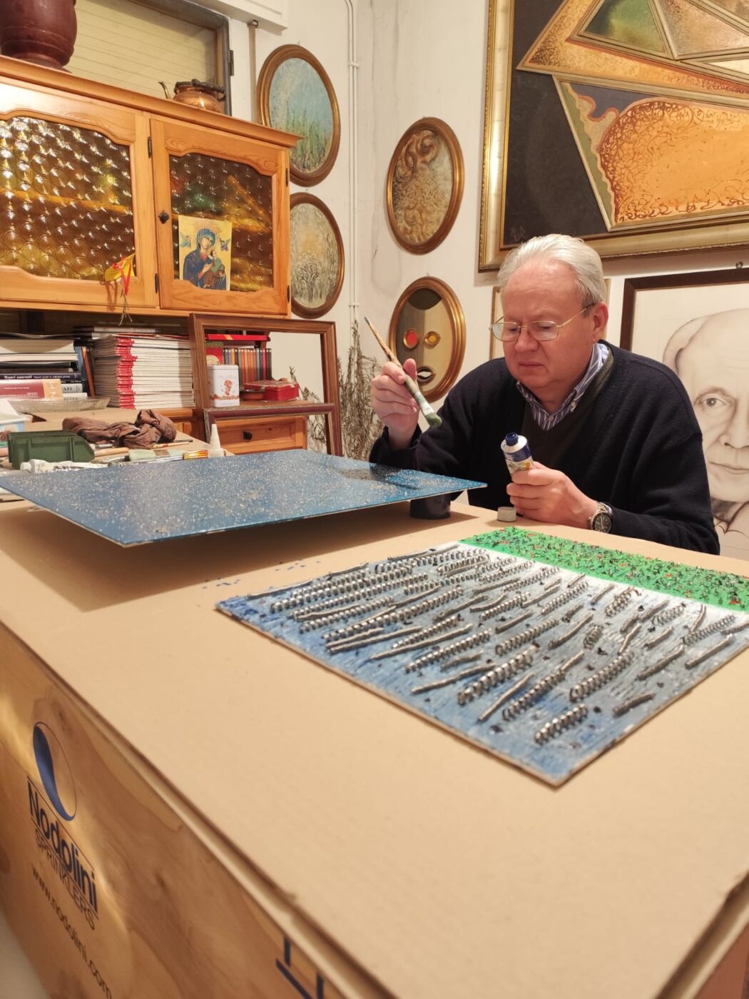 GOVERNOLO Nella mostra dal titolo “Abiogenesi”, in corso per tre fine settimana nella sede della Fondazione Mondo Rurale e Insieme per la Terra a Governolo di Roncoferraro, è evidente l’influenza del grande ed eclettico artista luzzarese Cesare Zavattini. Il pittore Saverio Nodolini nasce a Guastalla nell’anno 1964, è conosciuto per l’alta qualità degli irrigatori a pioggia che costruisce nella sua officina di Luzzara. Figlio d’arte, ha vissuto l’esperienza artista del padre, respirando fin dall’infanzia il profumo dei colori ad olio, vedendo realizzare in modo egregio opere che erano per quei tempi all’avanguardia. E’ proprio per questo che Nodolini con esperienza ed accortezza, ha saputo vedere negli scarti che rimanevano dalle lavorazioni meccaniche l’opportunità di usarli facendo loro riacquistare vita. Esattamente come accadeva nel movimento dell’arte povera. A guardare le sue opere ci si rende conto che Luzzara ha lasciato ancora una volta un’impronta nel mondo dell’arte, poiché nelle opere di Nodolini possiamo apprezzare uno stile accorto e capace di proporci opere originali ed interessanti. L’artista riesce a far rivivere tele, colore e frammenti metallici, dando loro un suono vibrante, una visione onirica, facendoci immergere in un mondo ancestrale, catturati da uno spazio che ci riporta alle origini, quando nel caos primordiale si è formata la scintilla che ha prodotto la vita. Queste opere ti portano ad aleggiare nell’immensità del nostro universo. La mostra è stata realizzata con 24 opere, uniche nel suo genere, che trattano temi cari all’uomo dalla nascita della vita ad oggi: dal big bang all’armonia, dal materico alla depressione, tutto con l’intento di raccontare e raccontarsi così da esaltare l’arte povera. Dietro ad ogni opera c’è una profonda riflessione di ciò che ci circonda ma anche di ciò che proviene dall’anima più profonda. Un viaggio coinvolgente che sa stupire anche il visitatore meno attento.