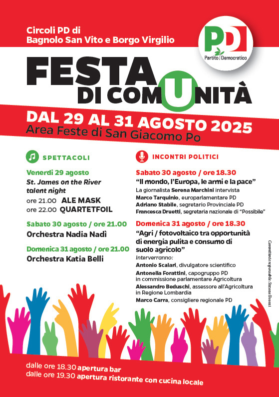 Un nuovo evento lungo tre giorni da venerdì a domenica (29-30-31 agosto) che unisce due Circoli e decine di volontari per dar vita, nell’Area Feste di San Giacomo Po, a tre serate di confronto su alcuni dei temi del momento, intrattenimento e buona cucina. I Circoli del Partito Democratico di Bagnolo San Vito e di Borgo Virgilio hanno organizzato insieme “Festa di ComUnità”, la cui prima edizione andrà in scena questo weekend a San Giacomo Po. Al lavoro ci saranno più di 40 volontari.