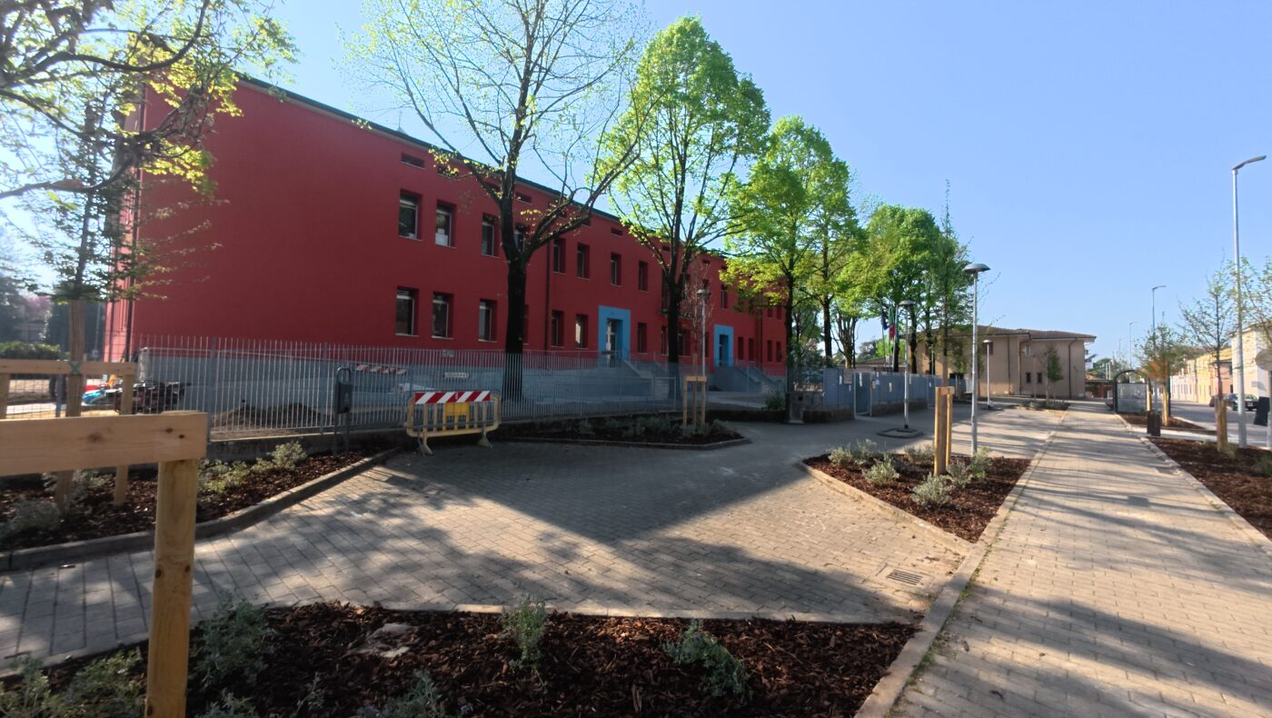 Davanti alla rinnovata scuola, che l’assessore Cicola sottolinea “non è mai stata chiusa, i ragazzi hanno pazientemente sopportato i cantieri, ma adesso possono godersi degli spazi rinnovati e più fruibili”.