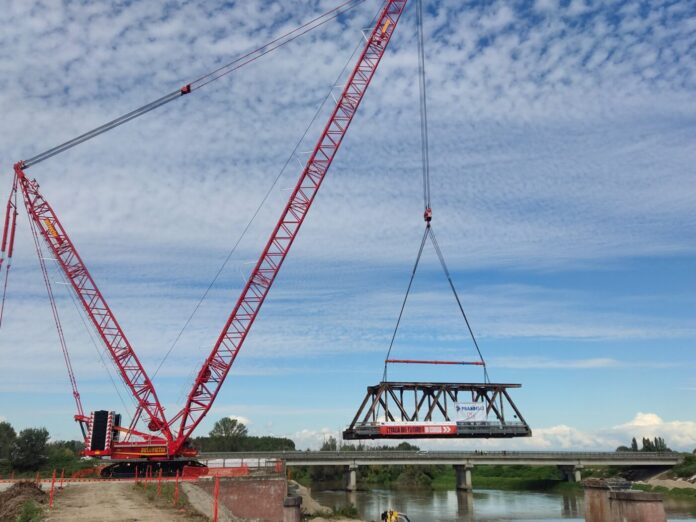 Sul lato Bozzolo è stata installata una Tadano CC 38.650, con una capacità di 625 tonnellate. Sul lato Marcaria, invece, ha dominato la scena una Demag CC6800, una delle macchine più potenti al mondo, con una portata nominale di 1250 tonnellate.