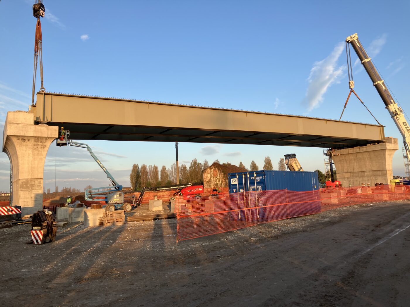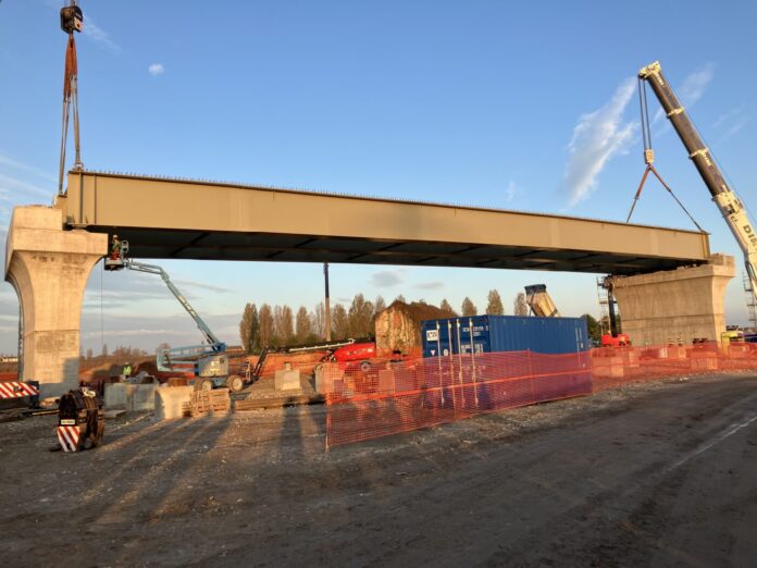 Nel pomeriggio di lunedì 17 invece, è stata compiuta la posa dell’impalcato metallico lungo 55 metri, 330 tonnellate di peso, tra le pile 3 e 4 del cavalcaferrovia, che si trova lungo la Sp 67 a Marcaria. Anche questa operazione – avvenuta tramite due maxi-gru che hanno sollevato in simultanea la trave imbragata – si è svolta con la massima precisione e puntualità.