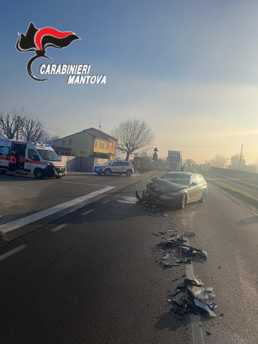 CASTEL D’ARIO Incidente con due feriti ieri  mattina alle ore 8.30 a Castel d’Ario sulla ex statale 10, dove si è verificato uno scontro frontale tra due autovetture. Un 35enne di Castel d’Ario ed un 59enne di Vercelli sono stati trasportati in codice giallo presso l’ospedale civile di Mantova. Sul posto per i rilievi i Carabinieri della Stazione di Roverbella.