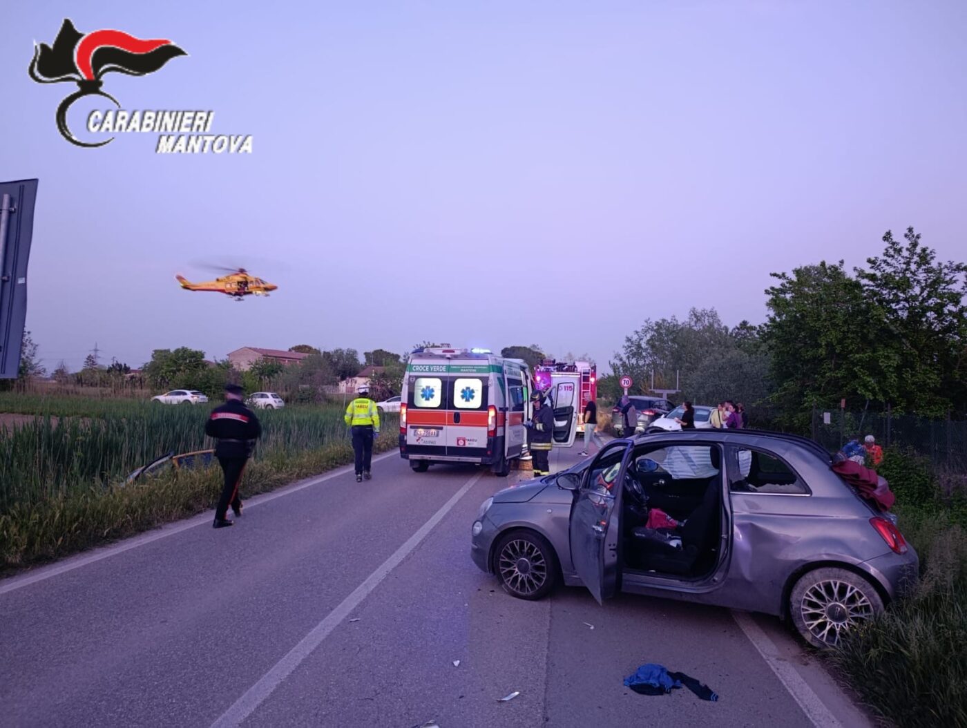 Ieri sera alle ore 20,00 in Roncoferraro, via stradello dei pastori, si è verificato un sinistro stradale. Trattasi di incidente tra due auto: una Fiat 500 condotta da un 47nne ed una Peugeot 208 condotta da un 22nne. Dalla ricostruzione del sinistro il conducente della Fiat 500 avrebbe iniziato la manovra di sorpasso della Peugeot mentre quest’ultimo veicolo stava svoltando a sinistra. Nel tentativo di evitare l’impatto il conducente della 500 si spostava a sinistra andando ad impattare su un manufatto in cemento. Il conducente veniva sbalzato fuori dall’abitacolo. Sul posto interveniva eliambulanza che lo trasportava presso gli spedali civili di Brescia in codice rosso -prognosi riservata_ a seguito del forte trauma cranico. Sul posto i Carabinieri della Stazione di San Giorgio Bigarello per i rilievi