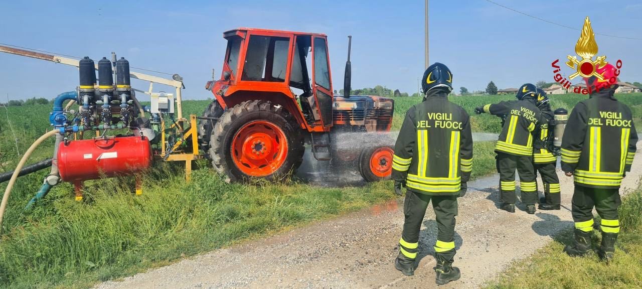 ASOLA Incendio di un trattore agricolo ieri intorno alle 15 in mezzo ai campi di Asola in via Pieve Cadelora. Sul posto sopraggiungeva la squadra vigili del fuoco del distaccamento volontario di Piadena con APS (autopompa serbatoio) e un ABP (autobotte) Dalla sede centrale di Mantova. Le squadre in posto riuscivano velocemente a mettere tutto lo scenario in sicurezza. Intervenuti anche i carabinieri forestali di Castiglione delle Stiviere.
