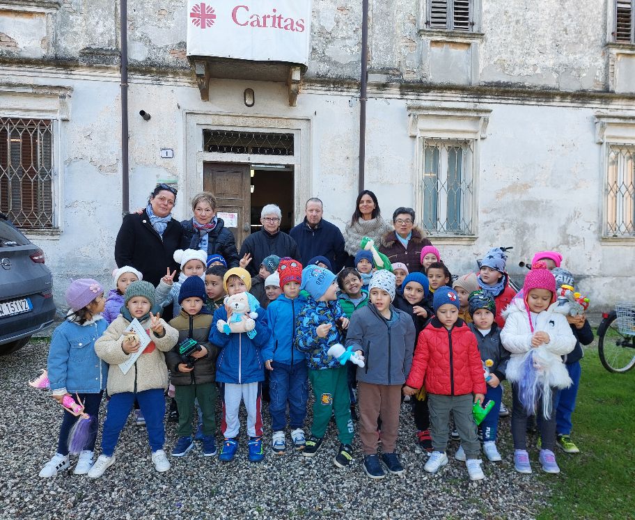 VILLIMPENTA – Prima di essere un vescovo e successivamente essere proclamato Santo, Martino era un soldato romano che prestava servizio nella guardia imperiale. La leggenda di San Martino racconta di come una sera, durante una delle ronde di sorveglianza che era tenuto a eseguire, egli incontrò un mendicante infreddolito, coperto solo da pochi stracci. Impietosito da quell’uomo che tremava e che sicuramente sarebbe morto prima dell’alba, Martino si sfilò il mantello bianco che simboleggiava la sua appartenenza all’Impero, e con la spada lo tagliò a metà, consegnandone una parte al poveretto. Una storia millenaria che ha in qualche modo ispirato i bimbi e le maestre Giovanna e Alessia della scuola dell’infanzia Maria Ausiliatrice di Villimpenta nel recarsi alla sede locale della Caritas diocesana con le loro “scatole del sorriso”. «Prendendo spunto dal gesto gentile di San Martino – spiegano le maestre – abbiamo pensato di proporre una piccola ma significativa iniziativa di “solidarietà”: chiedere ad ogni bimbo di portare a scuola un piccolo oggetto personale ancora in buono stato, come ad esempio un pupazzetto, matite colorate, libricini o gommine per cancellare e poi consegnare tutto il materiale, dopo averlo messi in uno scatolone decorato con la scritta “Per un bambino che voglio far sorridere”, alle volontarie della Caritas di Villimpenta. Donare ai più bisognosi è una manifestazione di misericordia strettamente connessa ai doveri di un buon cristiano. Ma al contempo è anche una forma di giustizia. E il gesto compiuto dai bimbi delle sezioni “mezzani” e “grandi” si pone in continuità con la sensibilità ed il sostegno che ogni anno lo storico asilo villimpentese fondato dal compianto don Ezio Foglia non fa mancare alla Caritas. Questa iniziativa non solo porta gioia a bambini meno fortunati ma insegna anche ai più piccoli il valore della generosità e della condivisione. La spontaneità e la semplicità dei bambini restano l’espressione più autentica di una comunità attenta a chi fa più fatica.