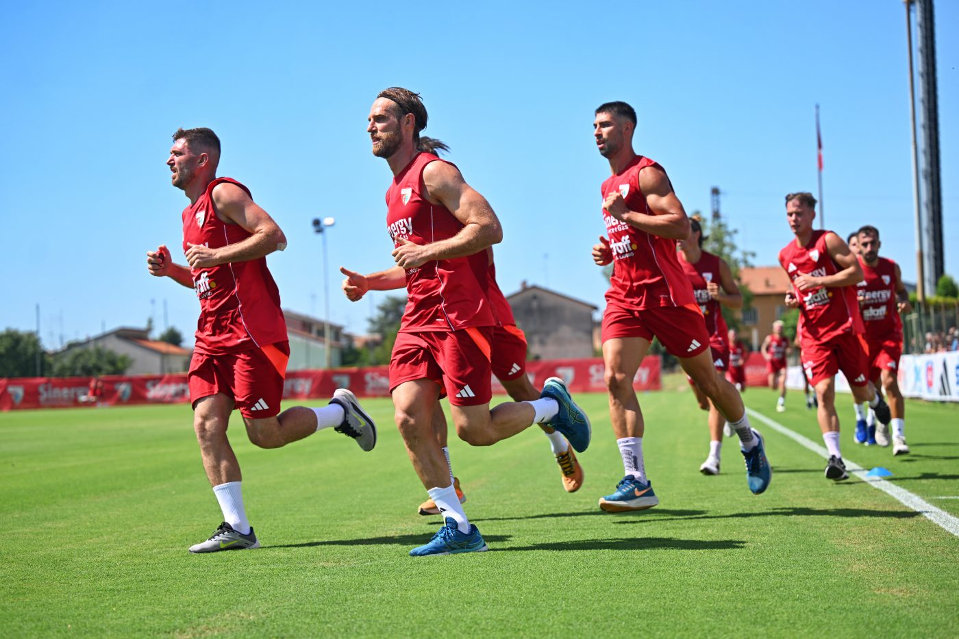 Un bel sole pieno, ma senza l’opprimente afa padana, ha illuminato l’intero allenamento, durato poco più di un’ora. Dopo la fase di riscaldamento, subito protagonista la palla con la squadra divisa in blocchi e Possanzini a dare le prime indicazioni su movimenti e passaggi. Uso massiccio di droni per riprendere gli schemi dall’alto, immagini che saranno oggetto di minuziose analisi da parte dell’allenatore con i giocatori. Ci si attendeva una partitella finale, ma non c’è stata.