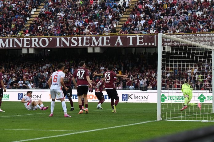 43′ La Salernitana lavora ai fianchi della difesa biancorossa, ma non trova l’acuto vincente.