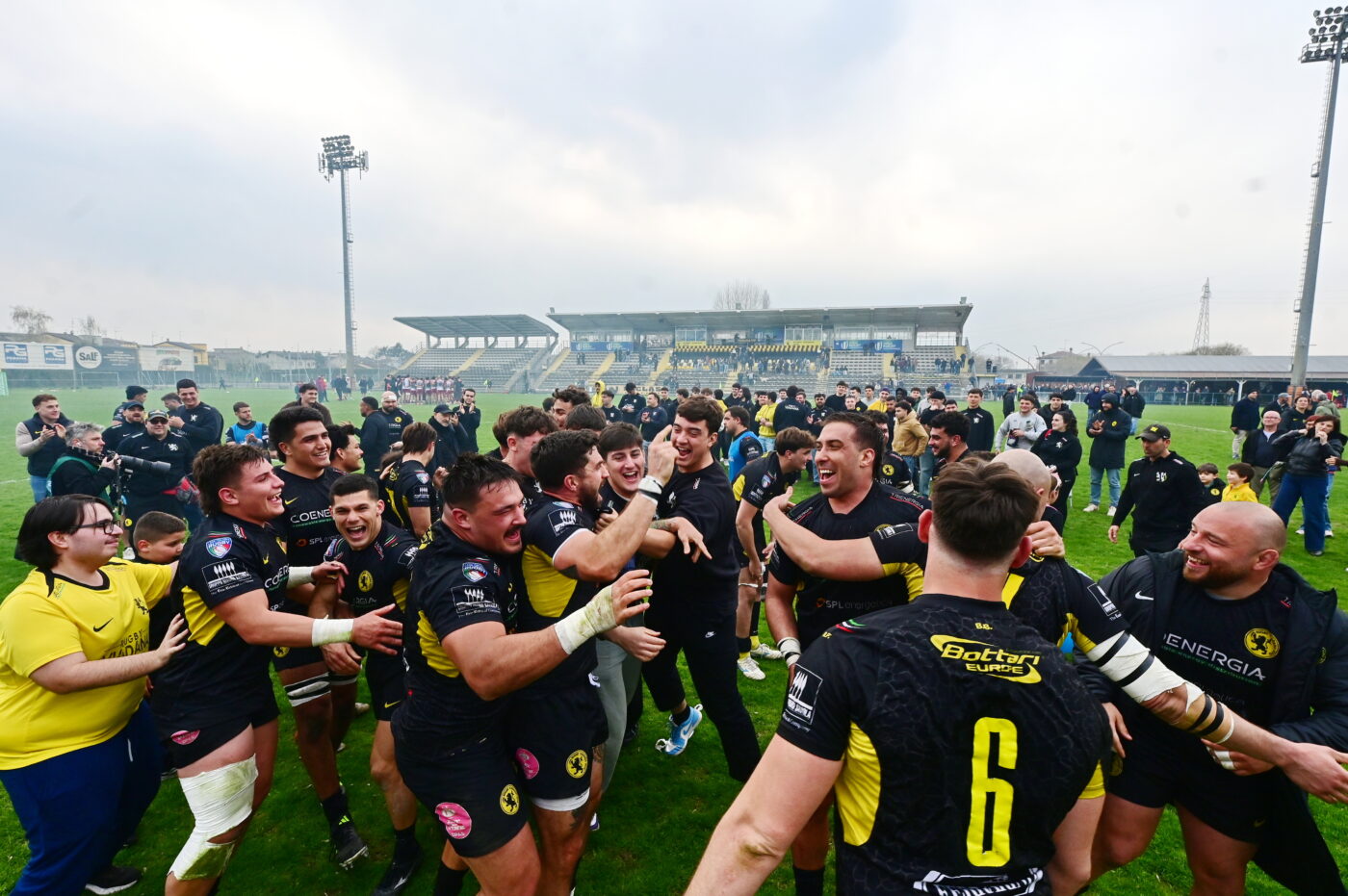 Nel secondo cambia totalmente la musica: il Viadana non concede punti alla corazzata reggiana e riparte con tre punti dalla piazzola firmati da Ferro (10-21) e poi trova una meta davvero bella con Jelic, che in situazione di precario equilibrio trova il modo per confezionare uno splendido assist per Bussaglia. Il trequarti ala ha lo sprint giusto per varcare la soglia e andare a referto (15-21). Al 63’ arriva la marcatura decisiva di Dorronsoro contro trasformazione del solito Ferro, ieri davvero implacabile (22-21). Con un punto solo di vantaggio la partita è una scarica di adrenalina dove la difesa giallonera è formidabile e in un’occasione è ancora Ferro a strappare l’ovale a un avversario, che stava schiacciando in meta, ma il salvataggio vale oro: vale la vittoria per un punto e anche la palma di player of the match. Il Valorugby Emilia ci prova ancora e ha in mano il match point, ma Hugo dalla piazzola è impreciso e Viadana tutta finalmente può festeggiare alla grande assieme ai suoi tifosi. Una vittoria da leoni con un cuore grande, davanti a un pubblico fantastico. Ora quindi il turno di riposo e il sabato di Pasqua di nuovo tutti allo Zaffanella per la sfida con i Rangers Vicenza.