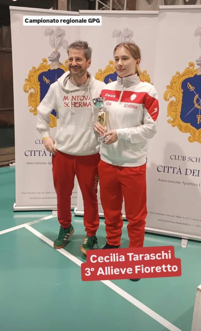 MANTOVA Ottima prestazione e medaglia di bronzo per Cecilia Taraschi nel Campionato Regionale Gpg di Gorle, andato in scena lo scorso weekend. L’atleta della Mantova Scherma, impegnata nel fioretto categoria allieve (2012), ha superato brillantemente la fase a gironi con quattro vittorie e una sola sconfitta, per poi imporsi anche nei successivi assalti a eliminazione diretta, conquistando l’accesso alla semifinale. Qui ha dovuto cedere ad Adelaide Rosini della Brescia Scherma, poi vincitrice del torneo. Per Taraschi doppio impegno nella stessa giornata: ha infatti preso parte anche alla prova di spada, chiudendo al 15° posto. Risultati positivi anche nel fioretto maschile allievi, dove Andrea Camurri ha chiuso in ottava posizione. Nella stessa categoria Michele Caione (11°), Gabriel Groposila (19°) e Giacomo Savoia (28°). La compagine virgiliana si è presentata all’importante appuntamento regionale con ben tredici atleti, alcuni dei quali al debutto. Nella spada maschile allievi Giacomo Varini ha chiuso al 41° posto, con Alessio Tangianu (53°). Nel fioretto maschile categoria maschietti Matteo De Lucia si è fermato al 12° posto, penalizzato da una stoccata molto conte- stata che gli ha negato l’accesso ai migliori otto. Nel fioretto giovanissimi Gianmarco Pascazio ha chiuso 24°, Filippo Fameli Barosi 25° e Brando Sarzi Braga 34°. Nella spada maschietti Amedeo Vullo è giunto 21° e Cristian Brighenti 34°. Prossimi appuntamenti per gli atleti del maestro Michele Ronconi nel mese di aprile, con l’International Fencing di Brescia e il Campionato Italiano U14 di Ancona.