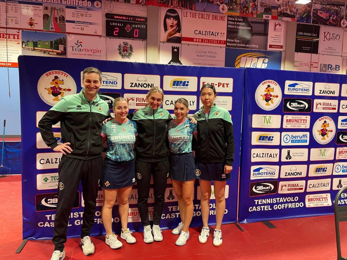 «E’ andata molto bene – afferma il presidente Franco Sciannimanico – Il dt Laghezza ha fatto girare la squadra: infatti Szocs ha giocato da numero tre. Ha iniziato e vinto la cinese Qi Fei, plauso a Nicole Arlia che sotto 2-0 con Plaian ha rimontato e portato sul 2-0 la Brunetti. Godiamoci questa vittoria contro un avversario che nel fine settimana aveva battuto a Cagliari il Fenerbahce, bissando il successo in Turchia e centrando la semifinale di Europe Cup». Nell’altro match di giornata il Südtirol ha vinto per 3-1 lo scontro salvezza col Muravera. Domani, come anticipato, la sfida di cartello: alle ore 19.30 si disputerà il derby sardo fra Sassari e Norbello. In classifica guida la Brunetti Castel Goffredo con 20 punti, davanti a Sassari e Norbello con 12, Quattro Mori con 8, Südtirol con 7 e Muravera con 1.