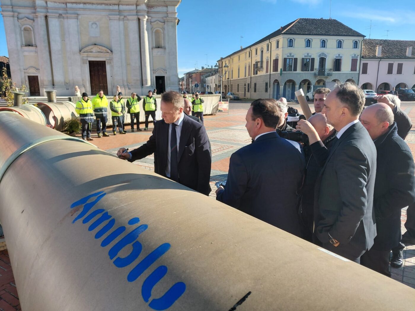 L’evento ha segnato la posa della prima pietra del progetto, che prevede la demolizione di 10,47 km della storica canala in cemento “Gronda Nord” e la realizzazione di una nuova condotta interrata in PRFV, con diametri di 1.400 e 1.200 mm. L’intervento coinvolgerà i territori di Quingentole, Borgo Mantovano e, in parte, Quistello, con un impatto diretto sul comparto agricolo locale.