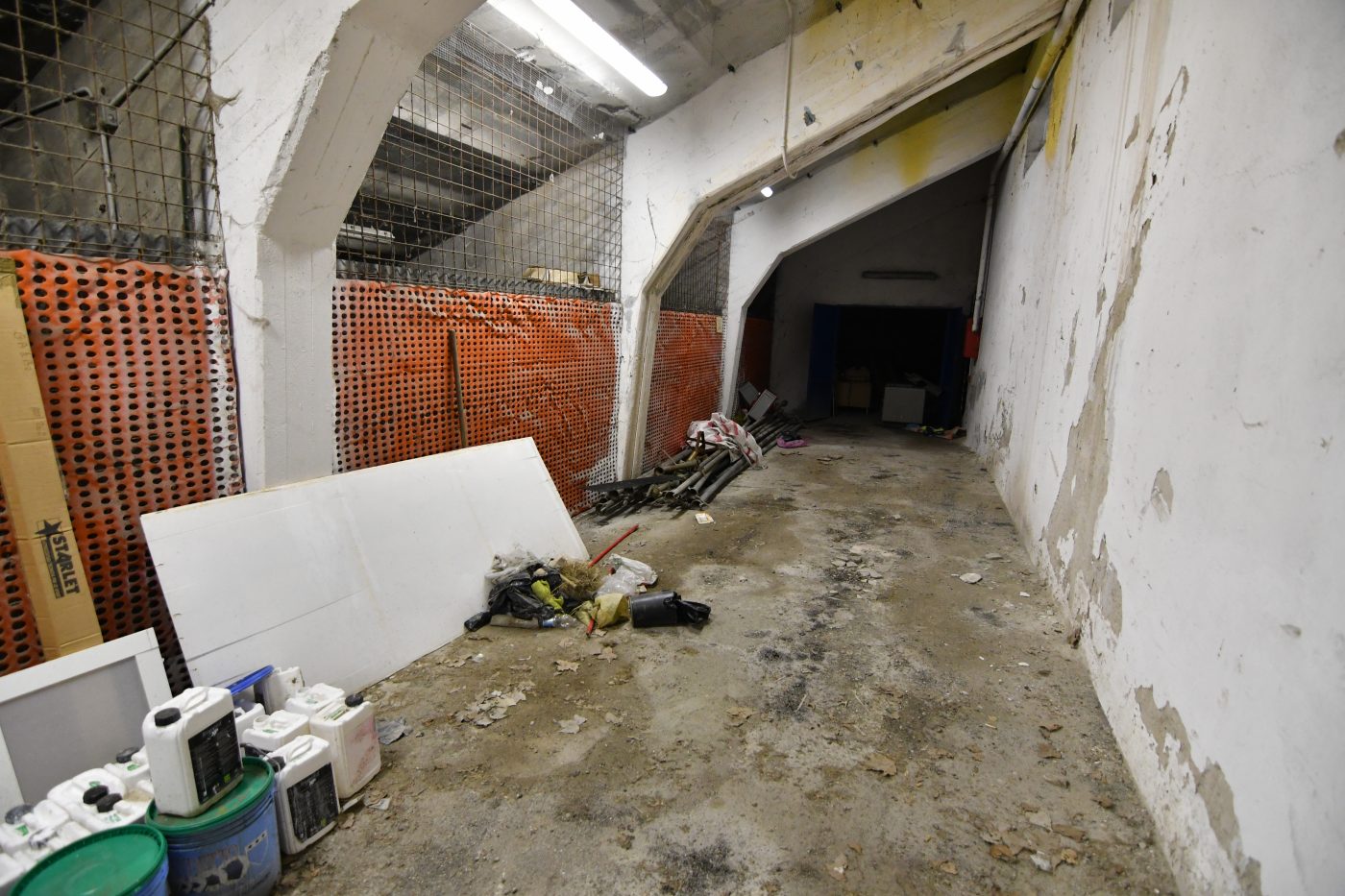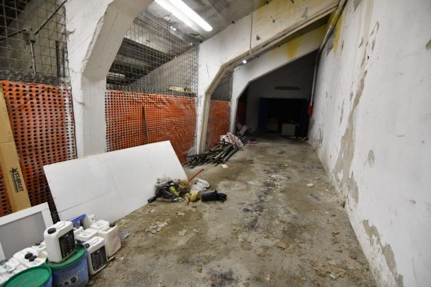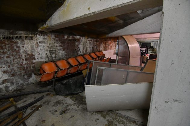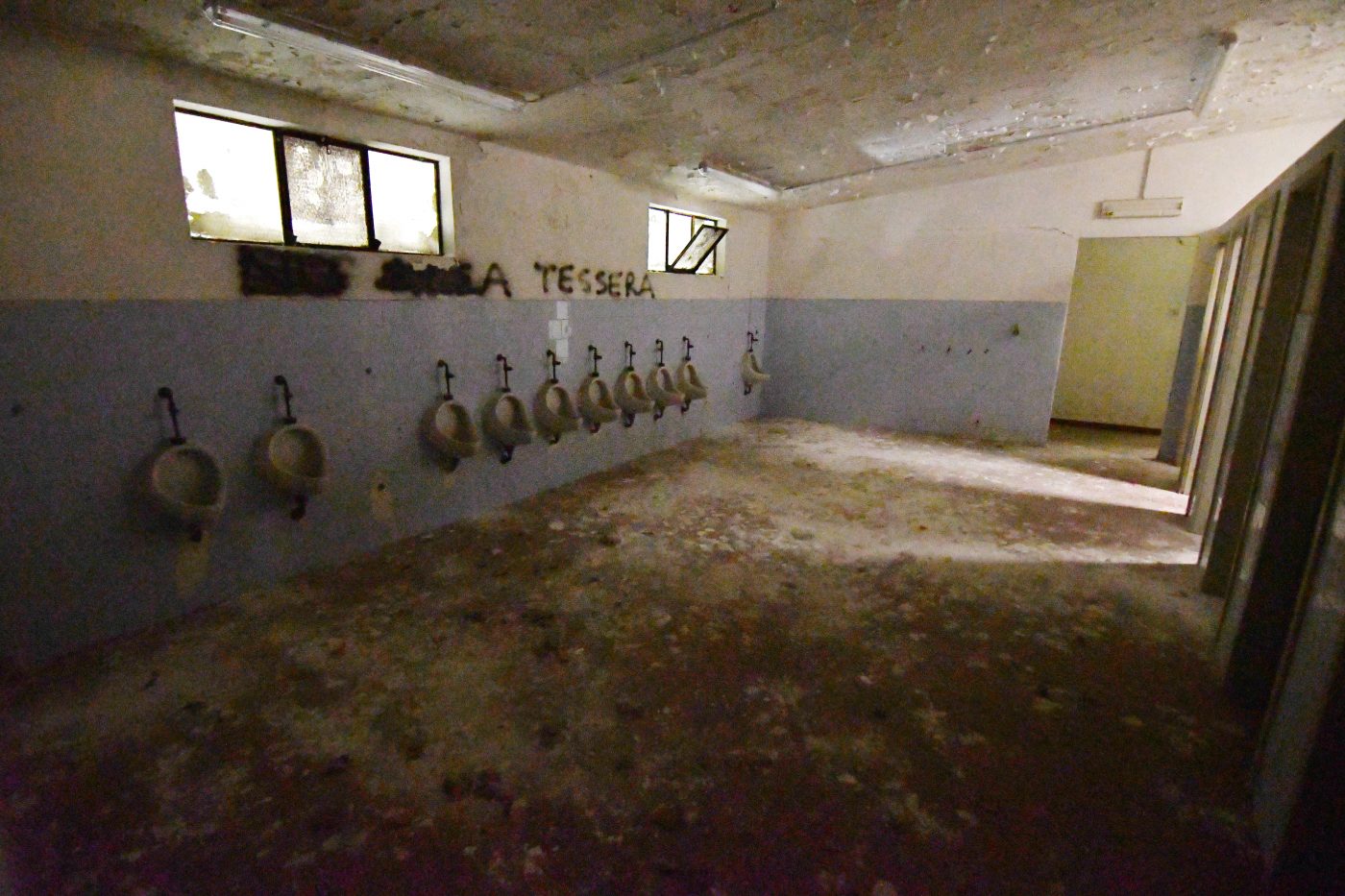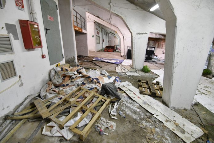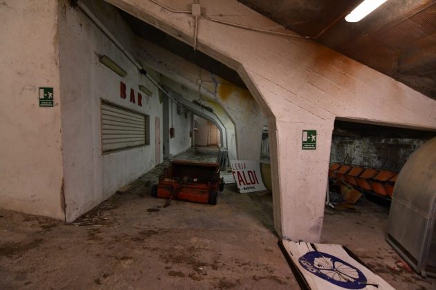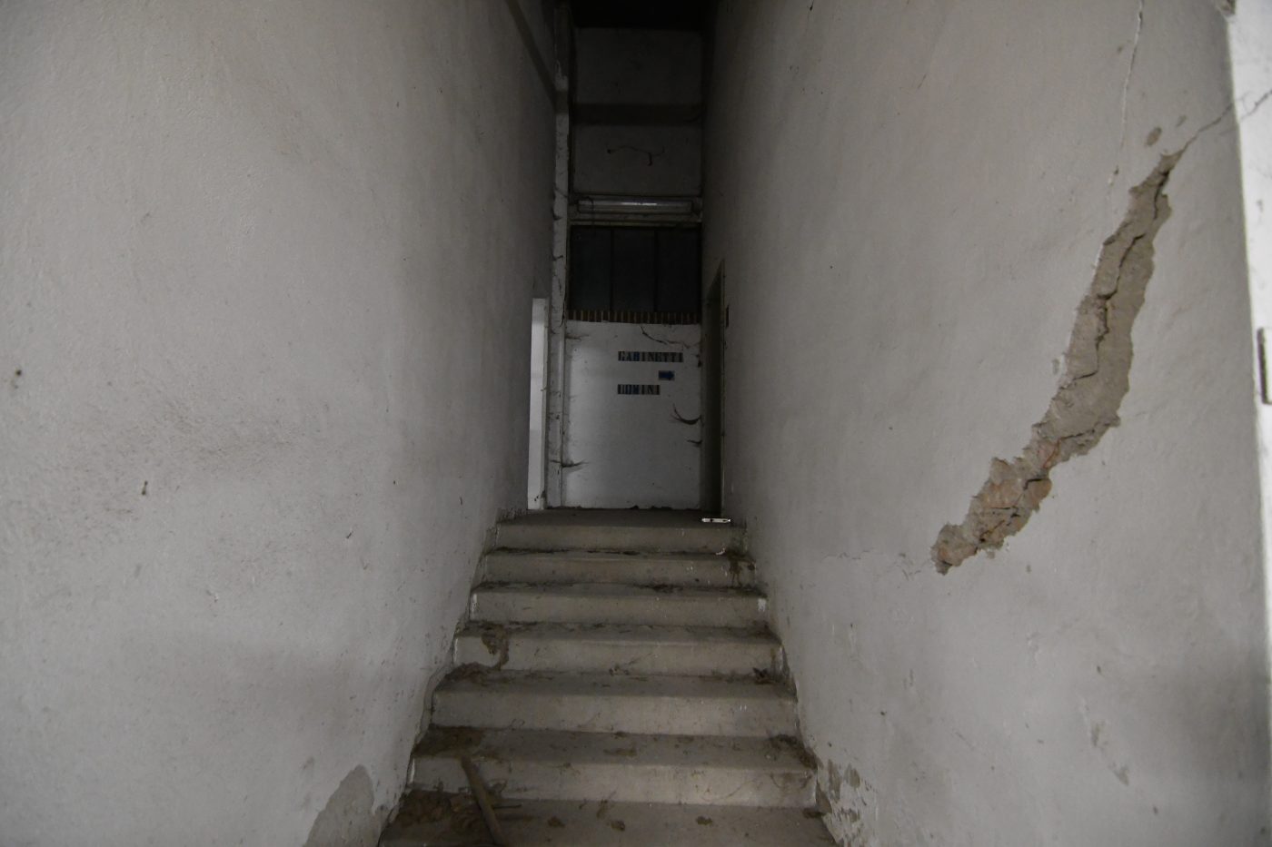 Le scalinate che conducono ai piani alti convivono tra i calcinacci che affievoliscono l’intenso color ruggine dei corrimano, mentre l’unica stanza a cui si ha accesso è l’ex sede del Gruppo Maschere Andreotti, un enorme deposito di carte, cartacce e cartoni.